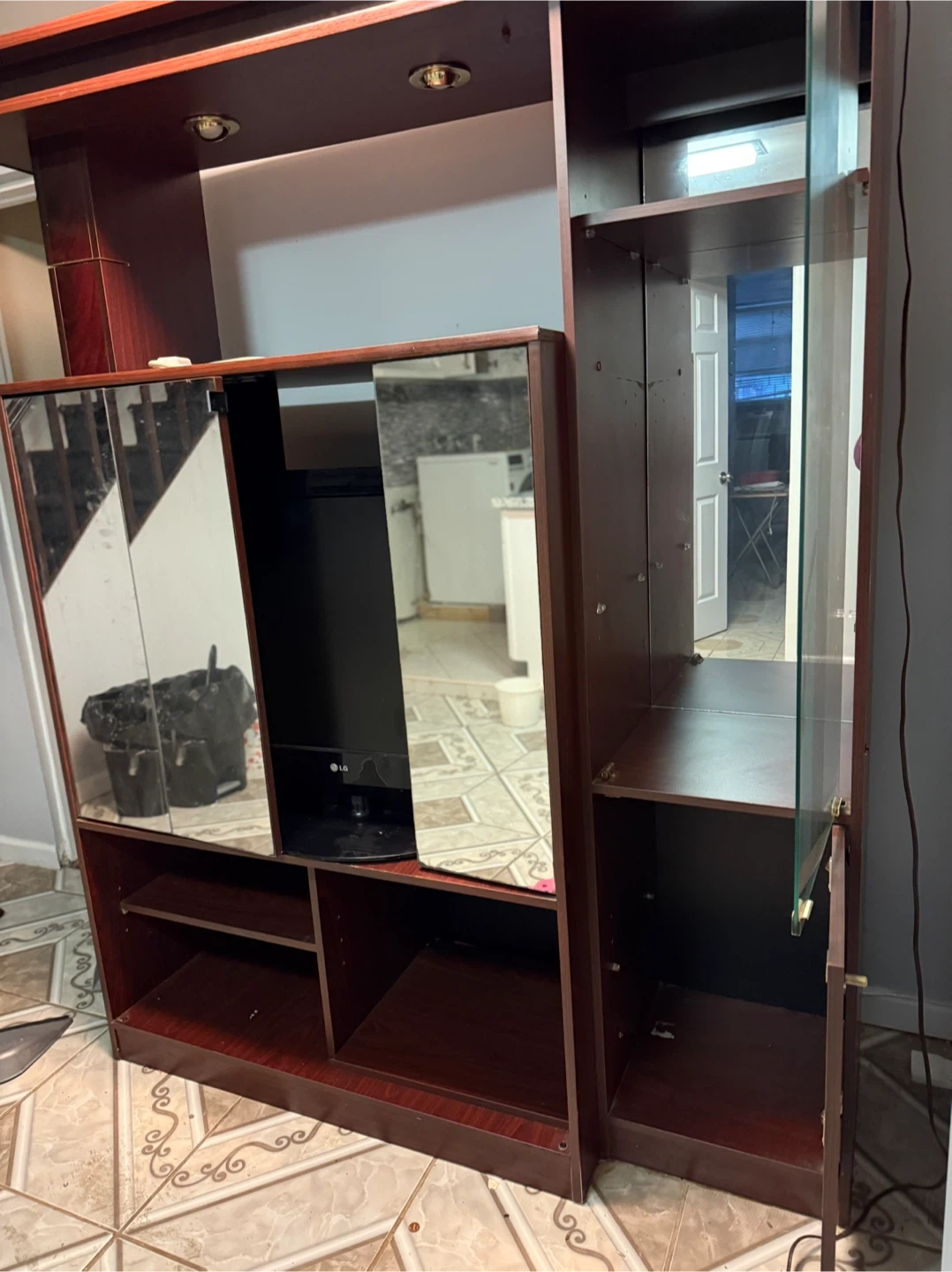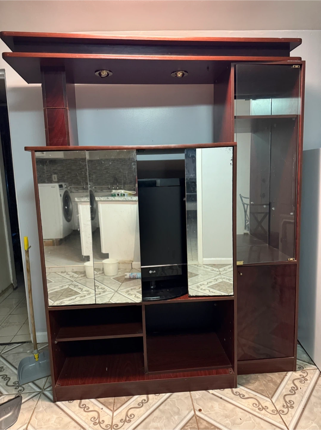 Selling a dark wood entertainment center featuring mirrored sliding doors and glass shelving. It's a great piece to display items or to hold a TV. The unit has built-in lighting at the top. It has some wear and tear, but is still very functional