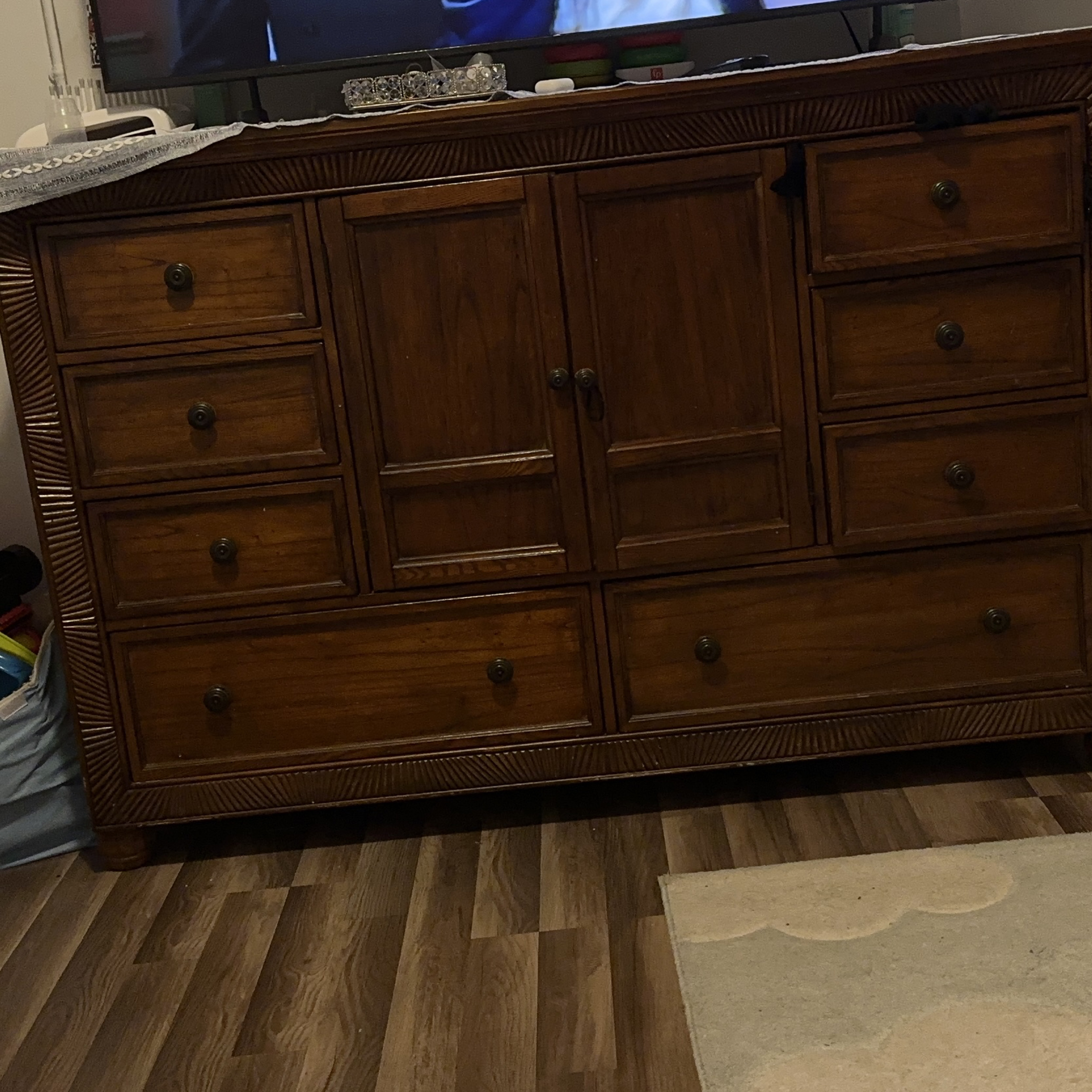 10Large dark wood dresser with multiple drawers and two cabinet doors. Features carved detailing around the edges. Great storage solution.
