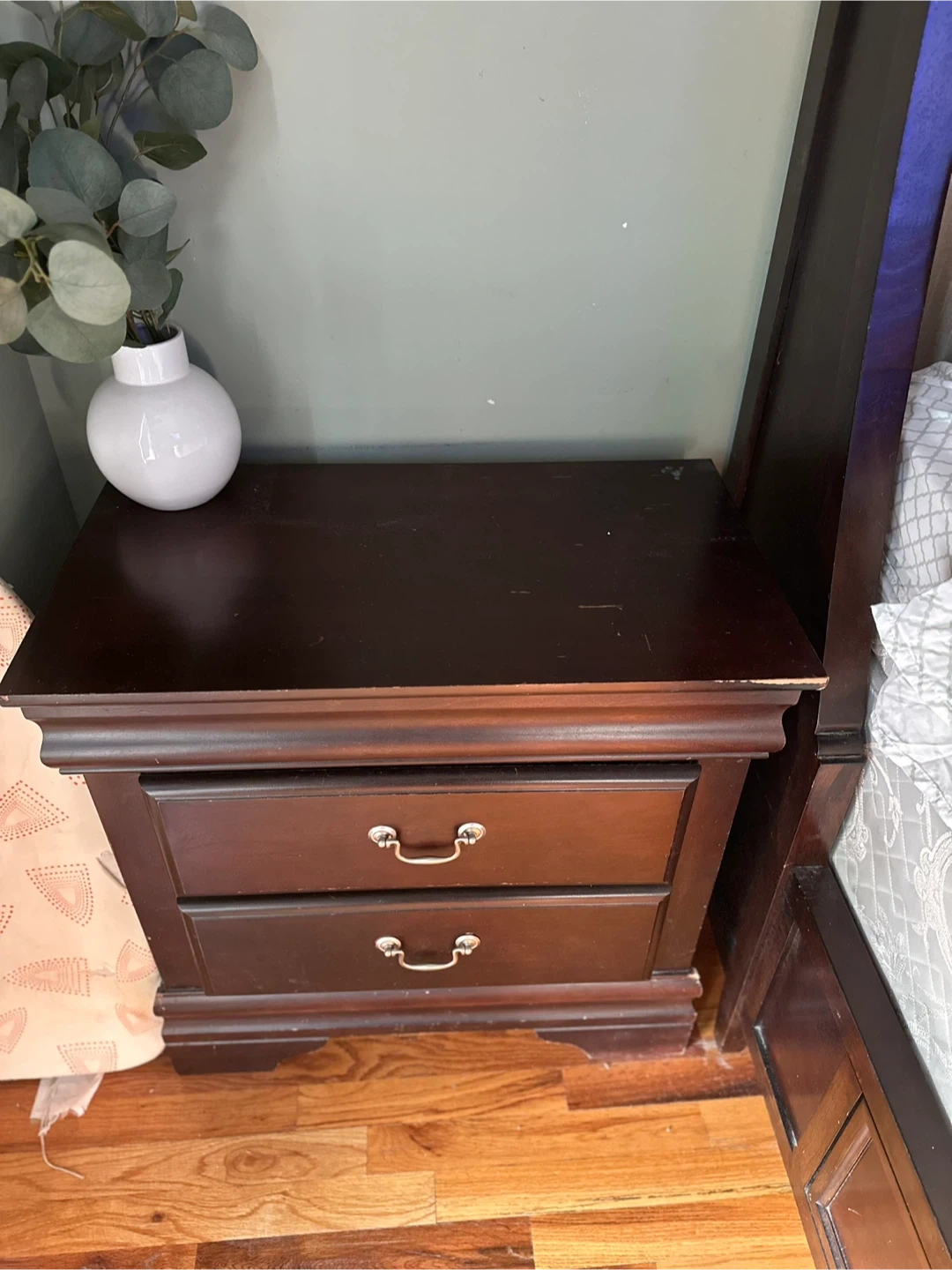 Selling a dark wood nightstand. It has two drawers with silver-colored handles. It's in good condition and would be a nice addition to any bedroom