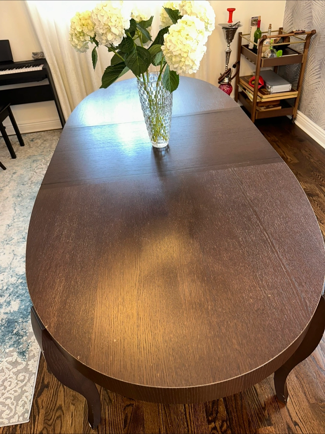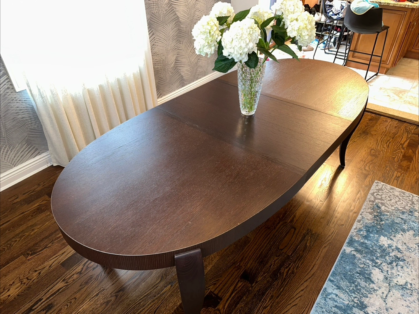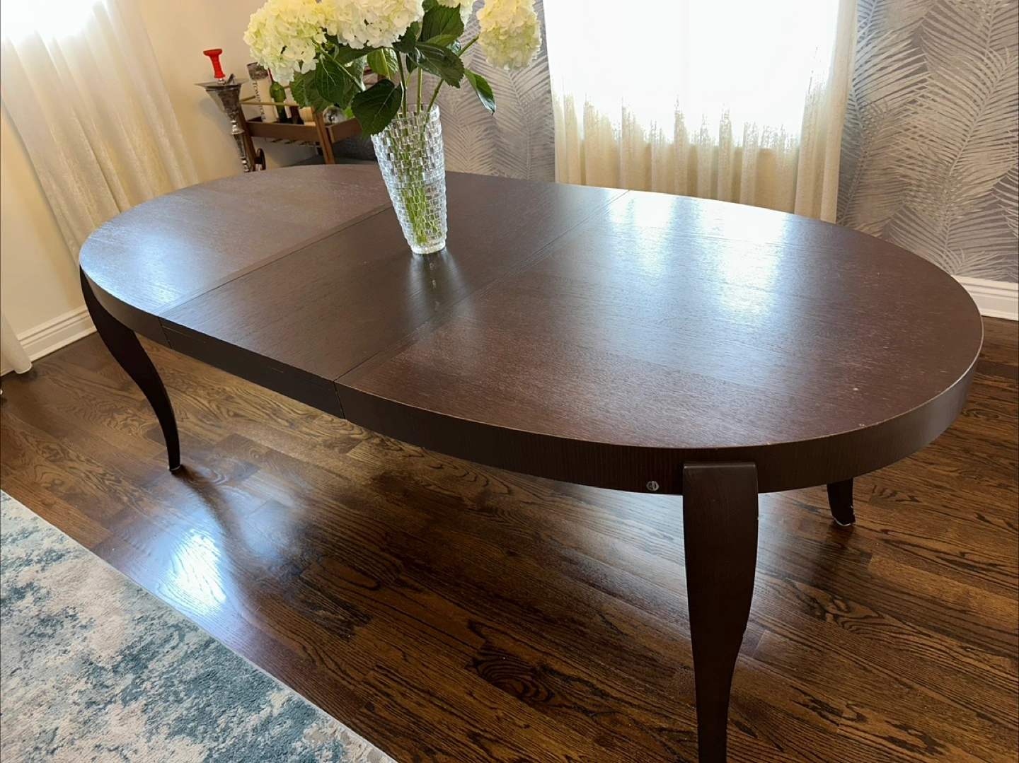 Oval dining table with dark wood finish. Rounded edges. Four legs supporting the table. The table is perfect for gathering with loved ones for a peaceful meal. Table measurement Dimensions (Closed Position): 68in x 40in Dimensions (Open Position): 90in x 40in