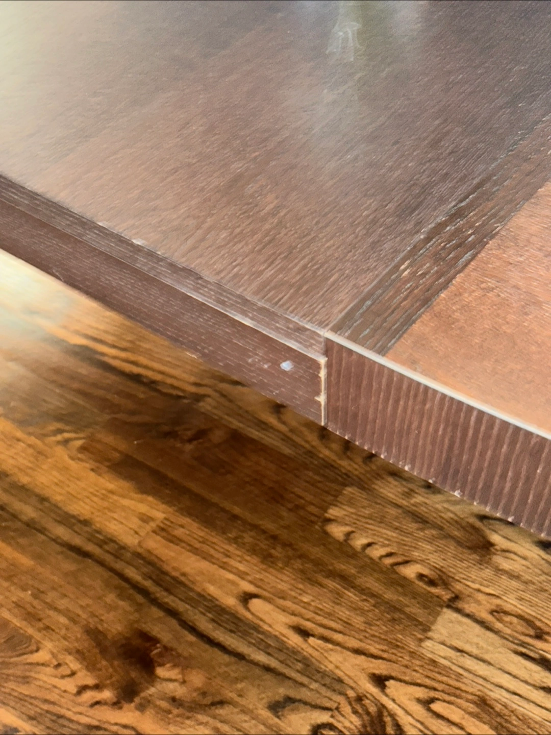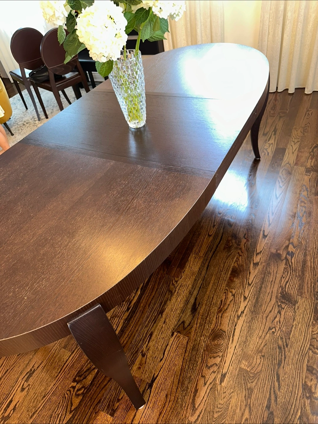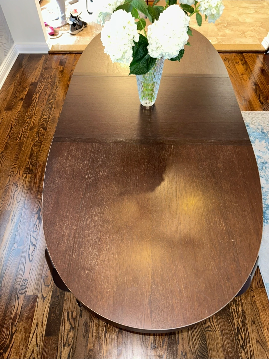 Oval dining table with dark wood finish. Rounded edges. Four legs supporting the table. The table is perfect for gathering with loved ones for a peaceful meal. Table measurement Dimensions (Closed Position): 68in x 40in Dimensions (Open Position): 90in x 40in
