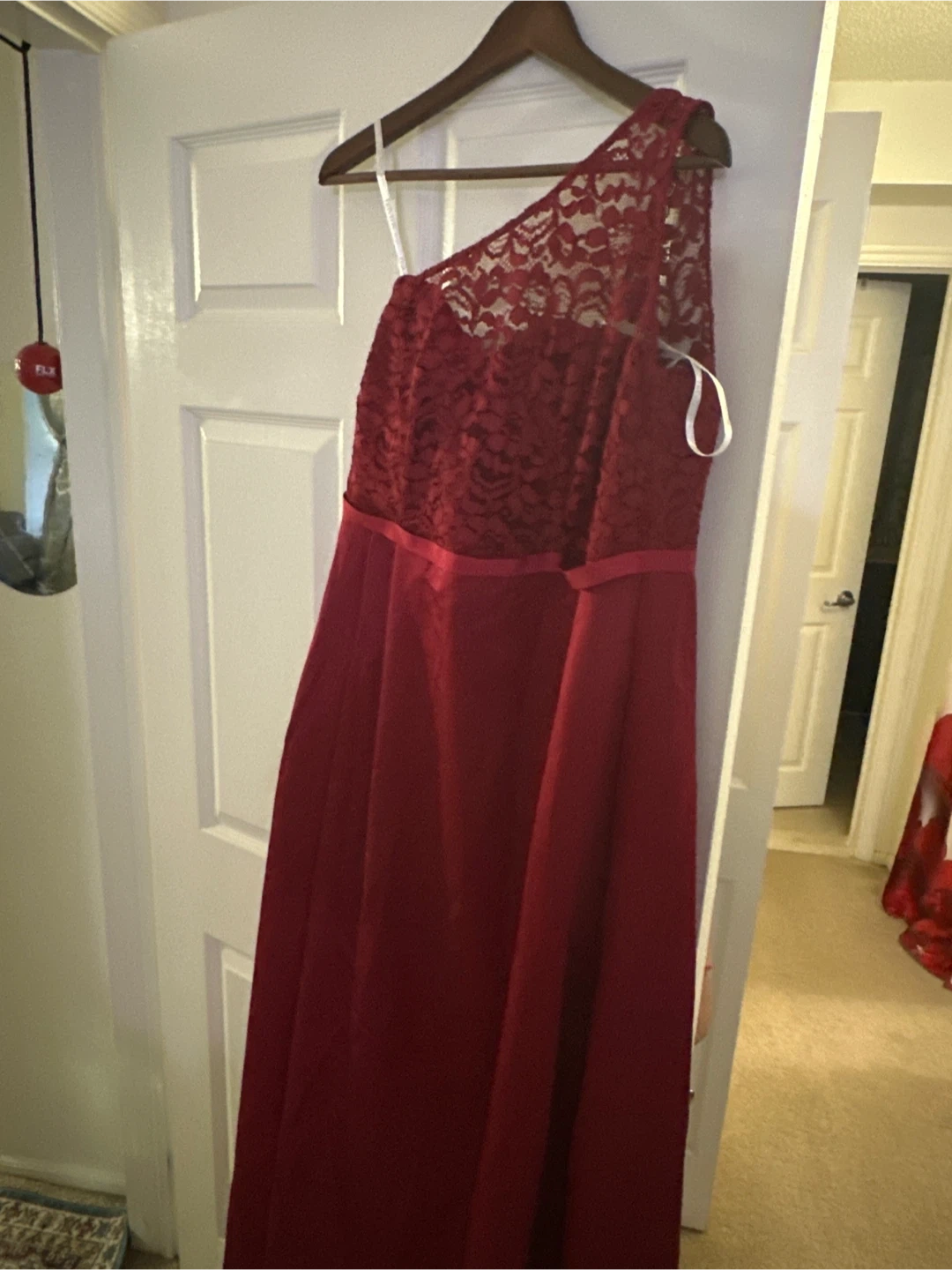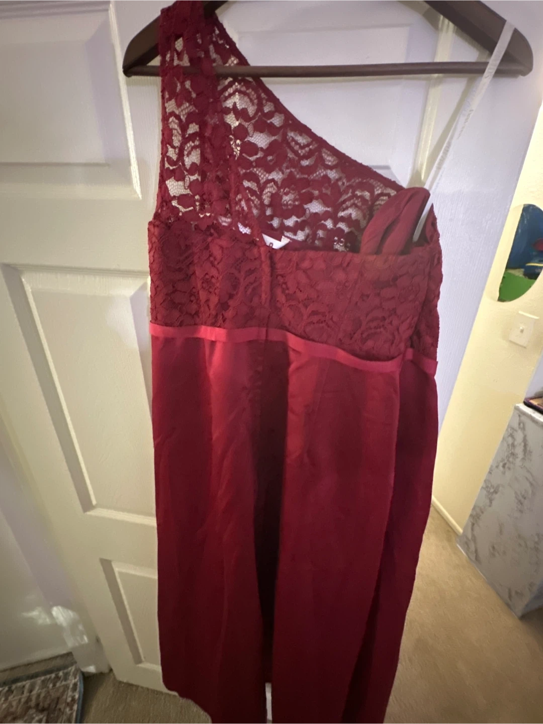 David’s Bridal Burgundy One-Shoulder Lace Dress