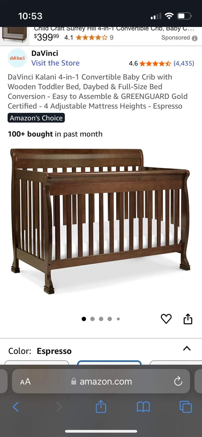 Selling a DaVinci Kalani 4-in-1 Convertible Baby Crib in Espresso color. This crib converts to a toddler bed, daybed, and full-size bed. It's easy to assemble and GREENGUARD Gold Certified. It also has 4 adjustable mattress heights