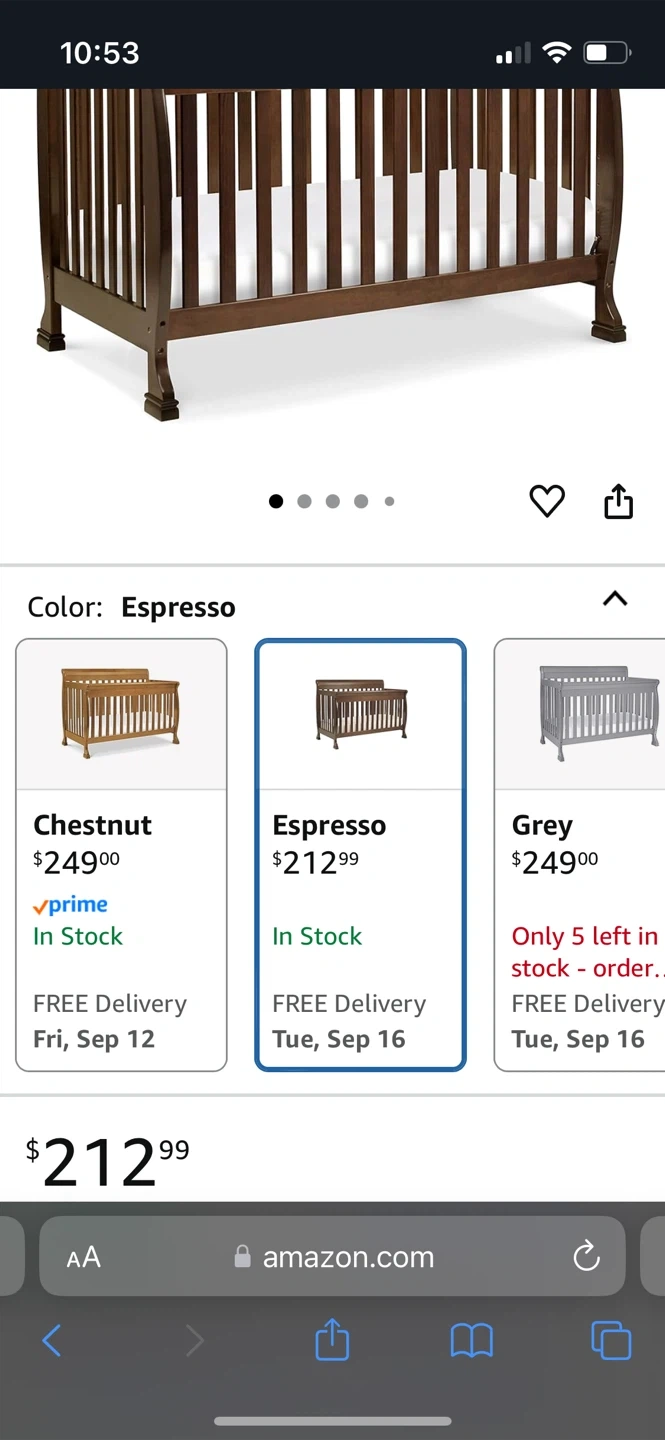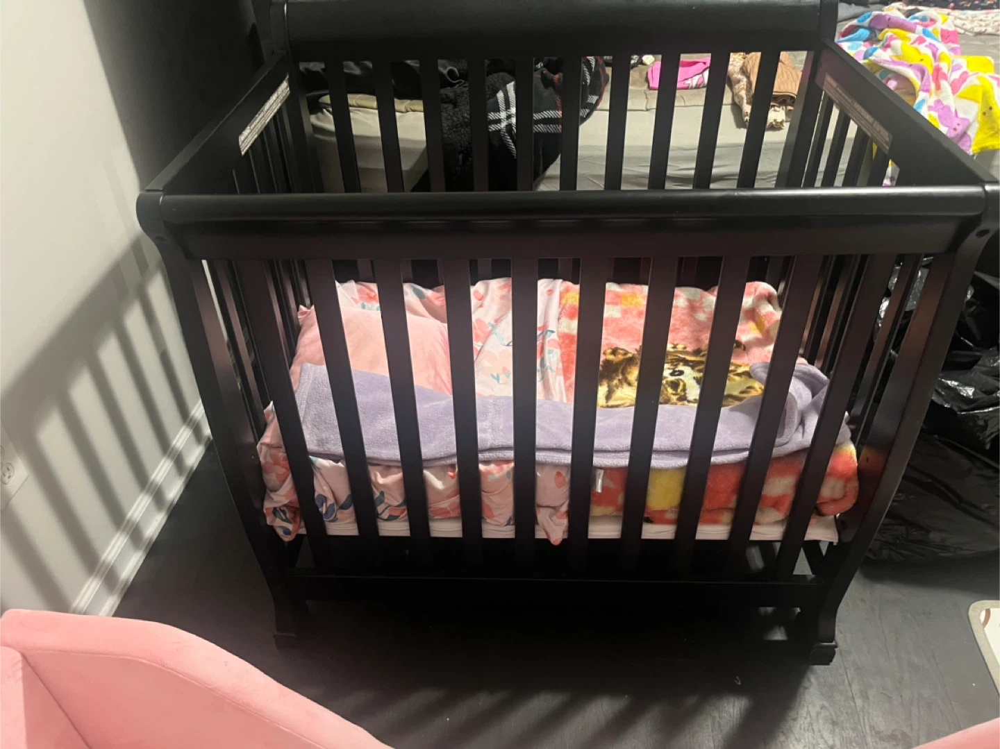 Selling a DaVinci Kalani 4-in-1 Convertible Baby Crib in Espresso color. This crib converts to a toddler bed, daybed, and full-size bed. It's easy to assemble and GREENGUARD Gold Certified. It also has 4 adjustable mattress heights