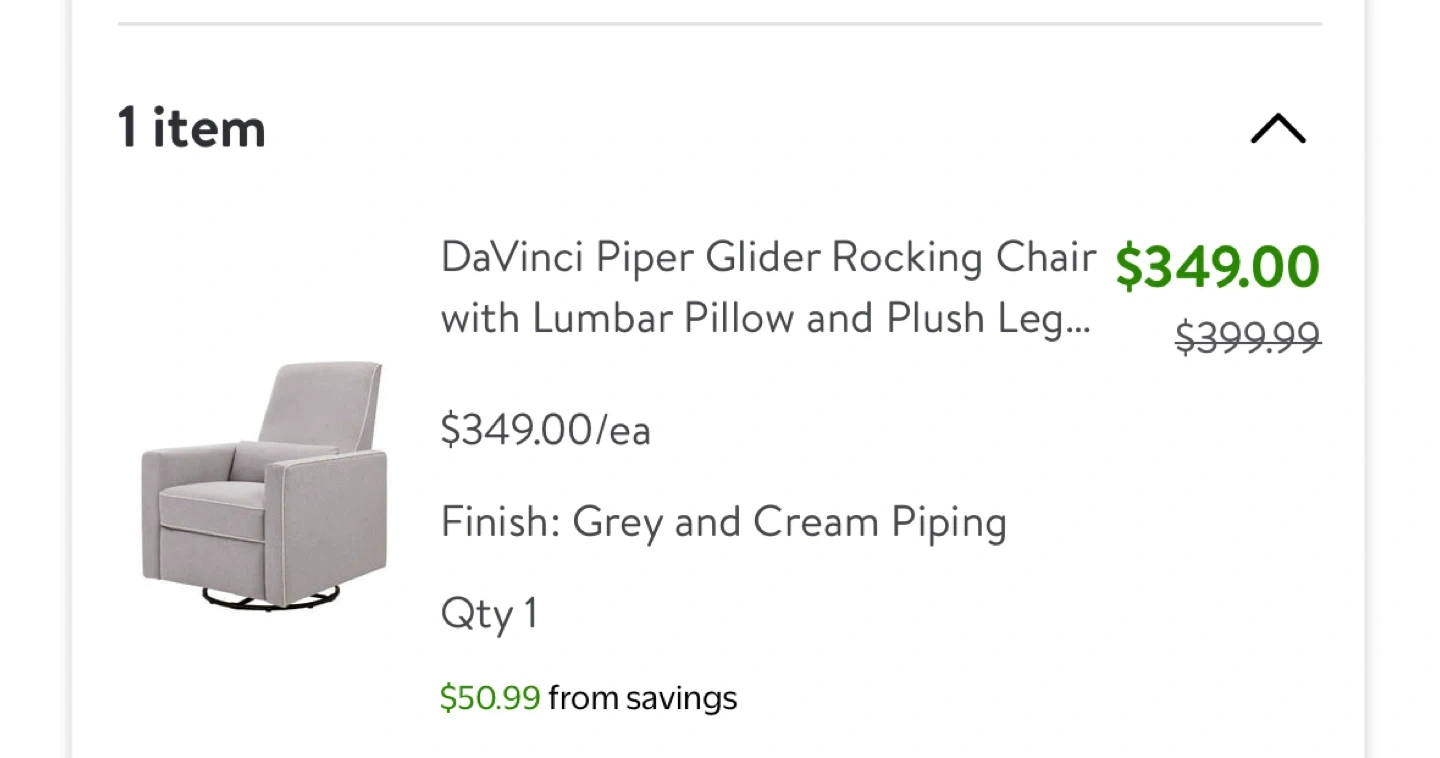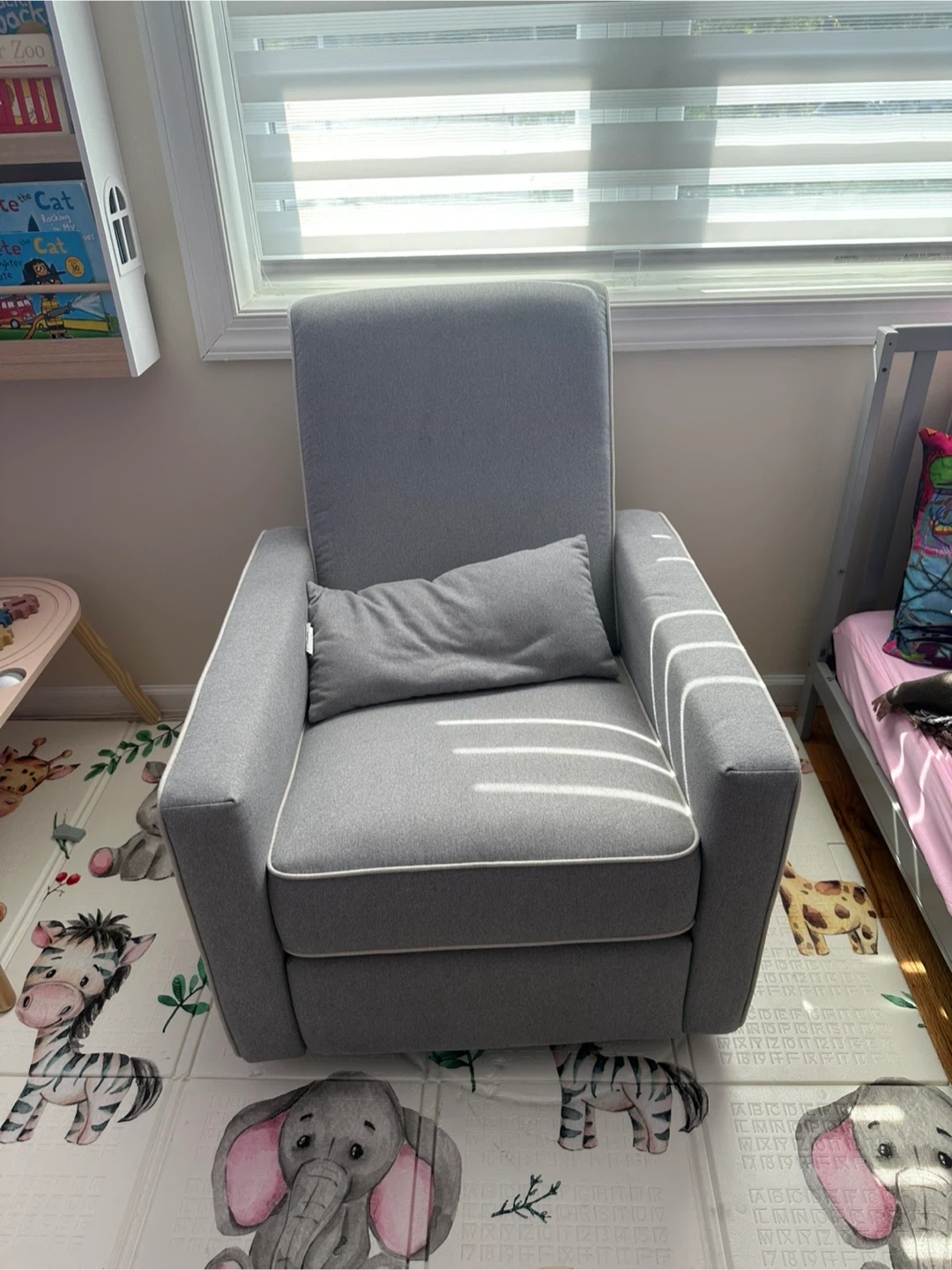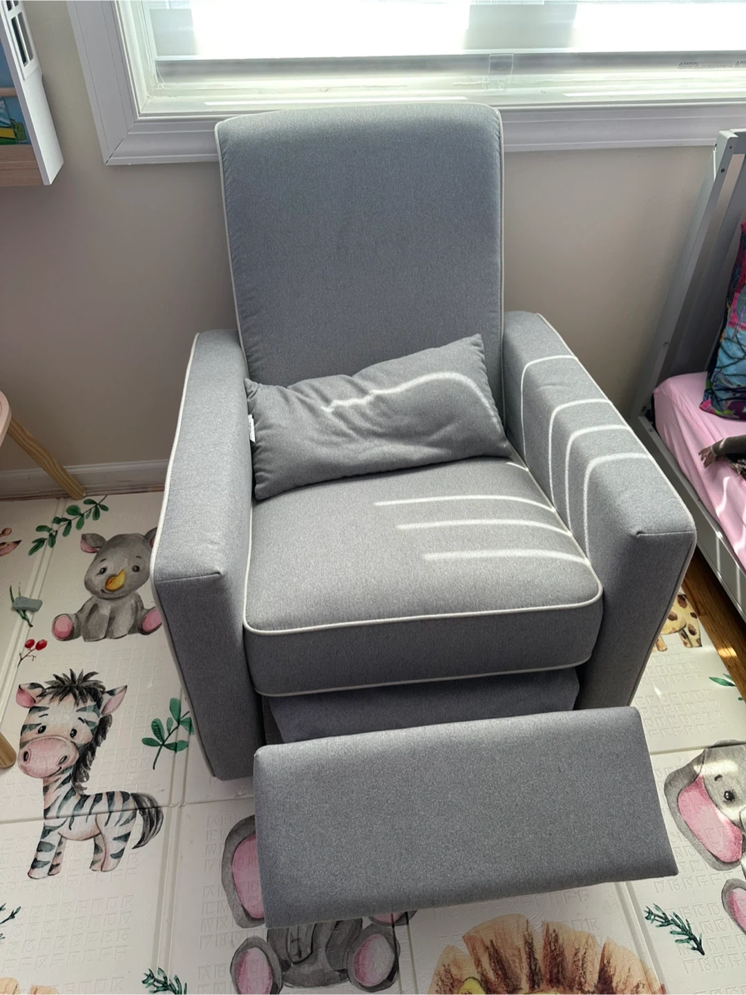 This is a Baby Relax glider and ottoman! It is in great condition and perfect for a nursery. The chair is a light gray color and comes with a matching pillow. It's super comfortable for feeding and rocking your little one original price $349.99