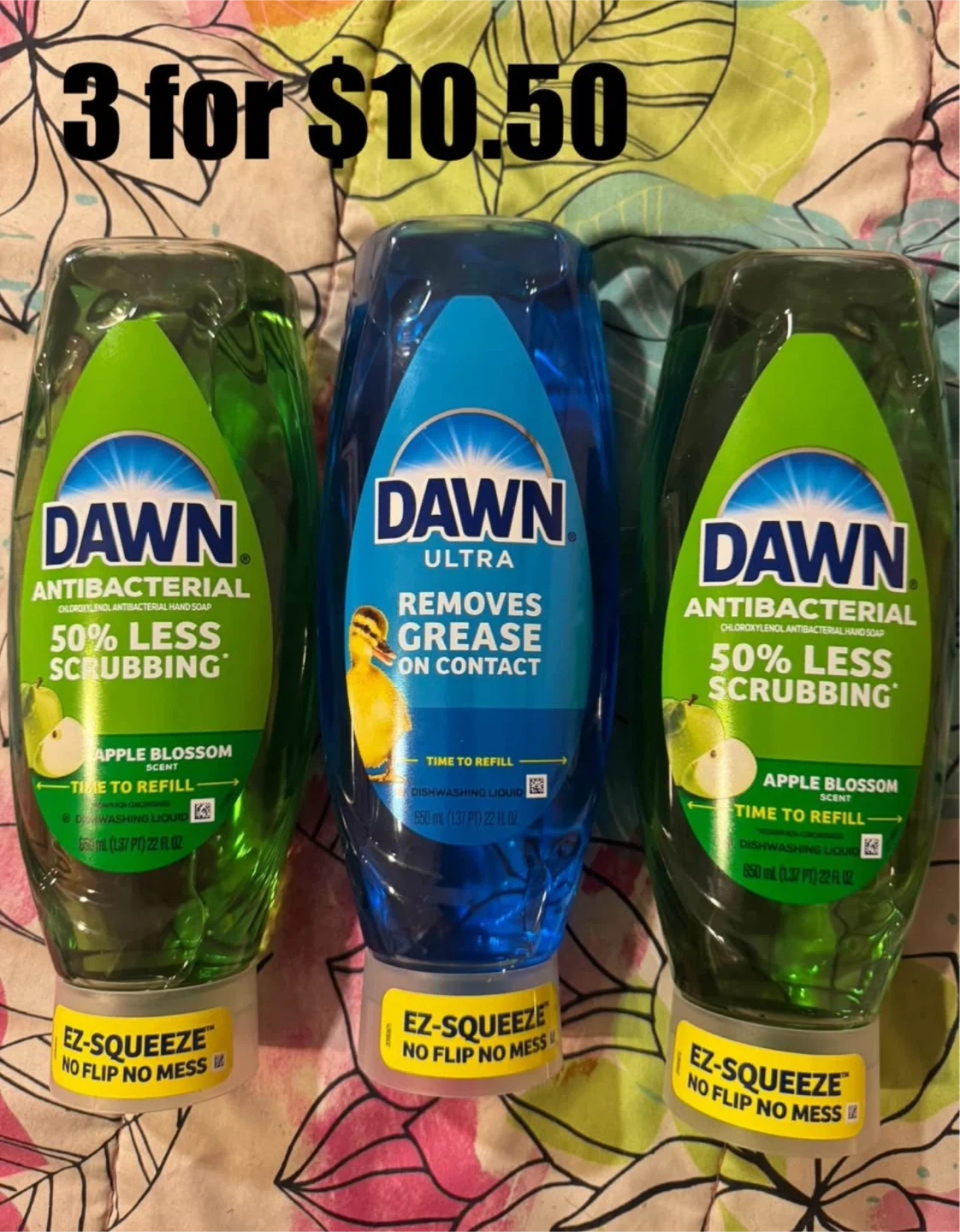 Selling three bottles of Dawn dish soap! You get two bottles of the Antibacterial Apple Blossom scent and one bottle of the Ultra grease-removing formula. Each bottle contains 650 ml (22 fl oz) of dishwashing liquid. They all have the EZ-Squeeze, no-flip, no-mess design