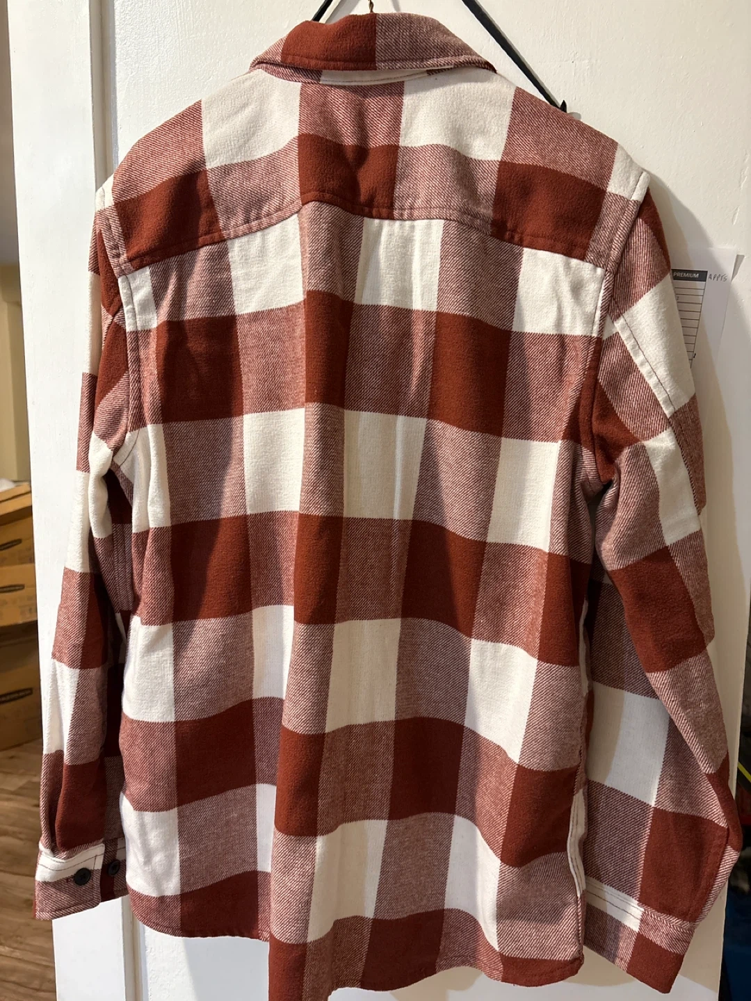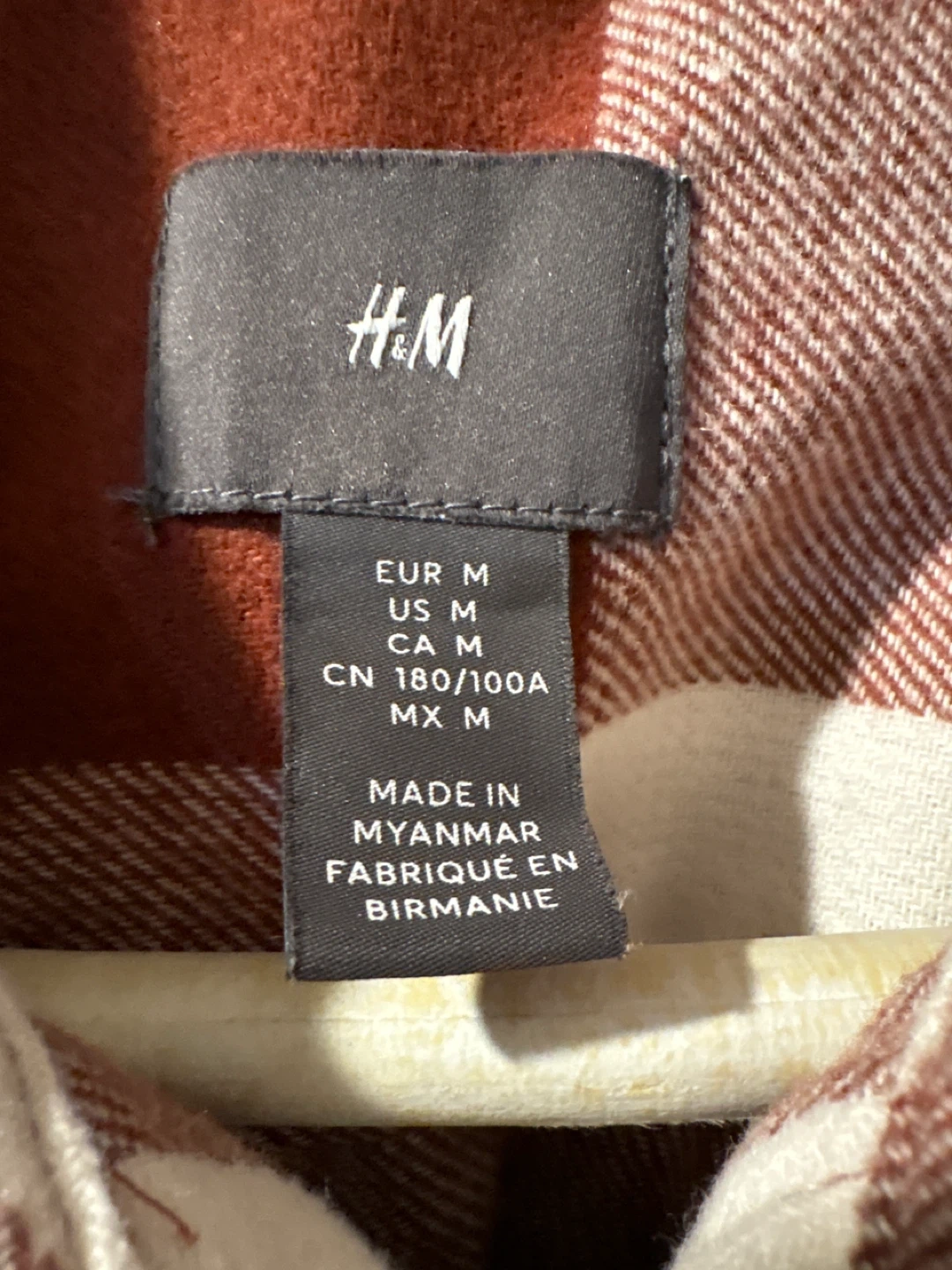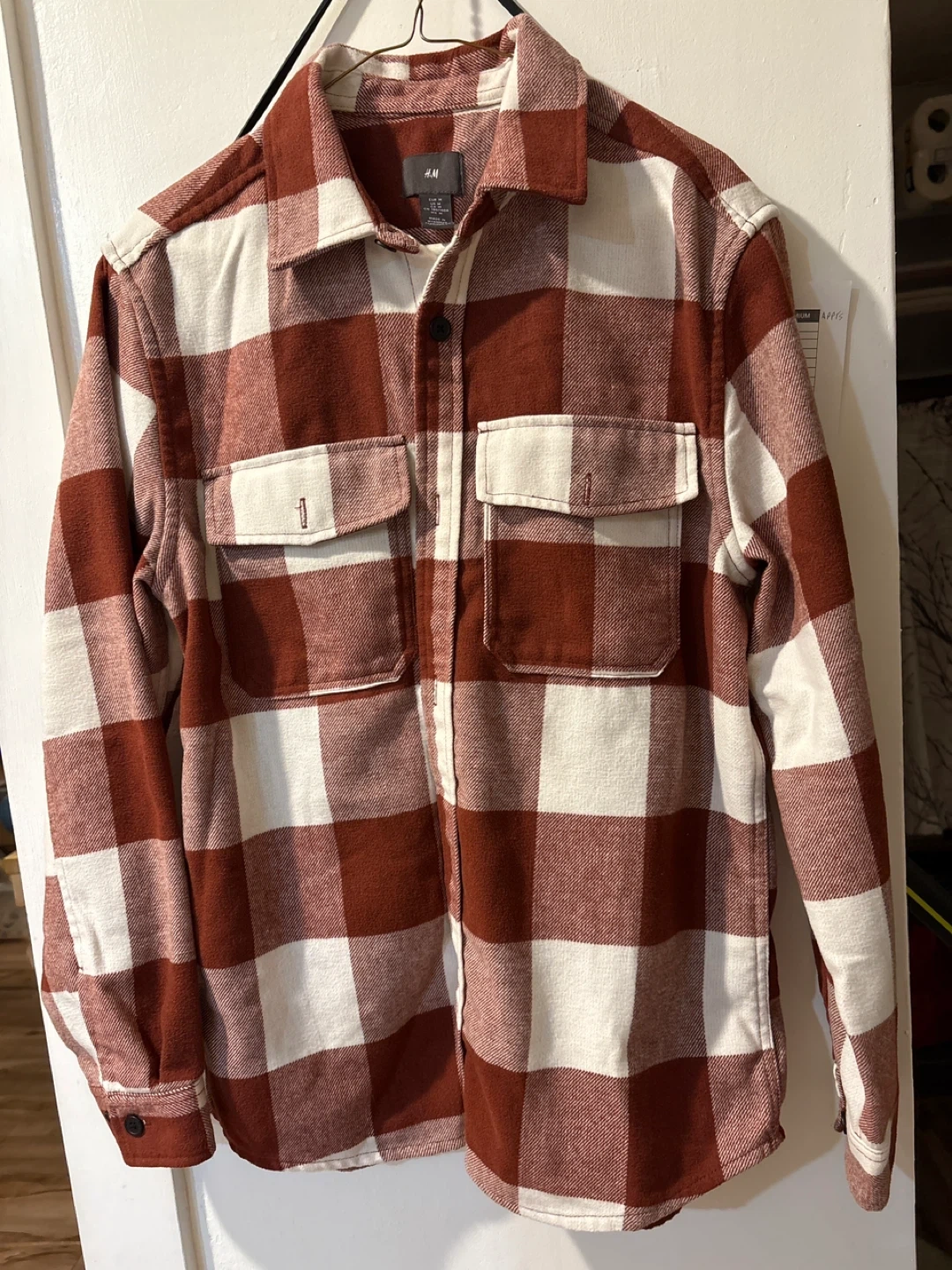 Selling a men's plaid flannel shirt from H&M in size M. The shirt features a brick red and white checkered pattern and has two chest pockets. It's in great condition and perfect for layering!