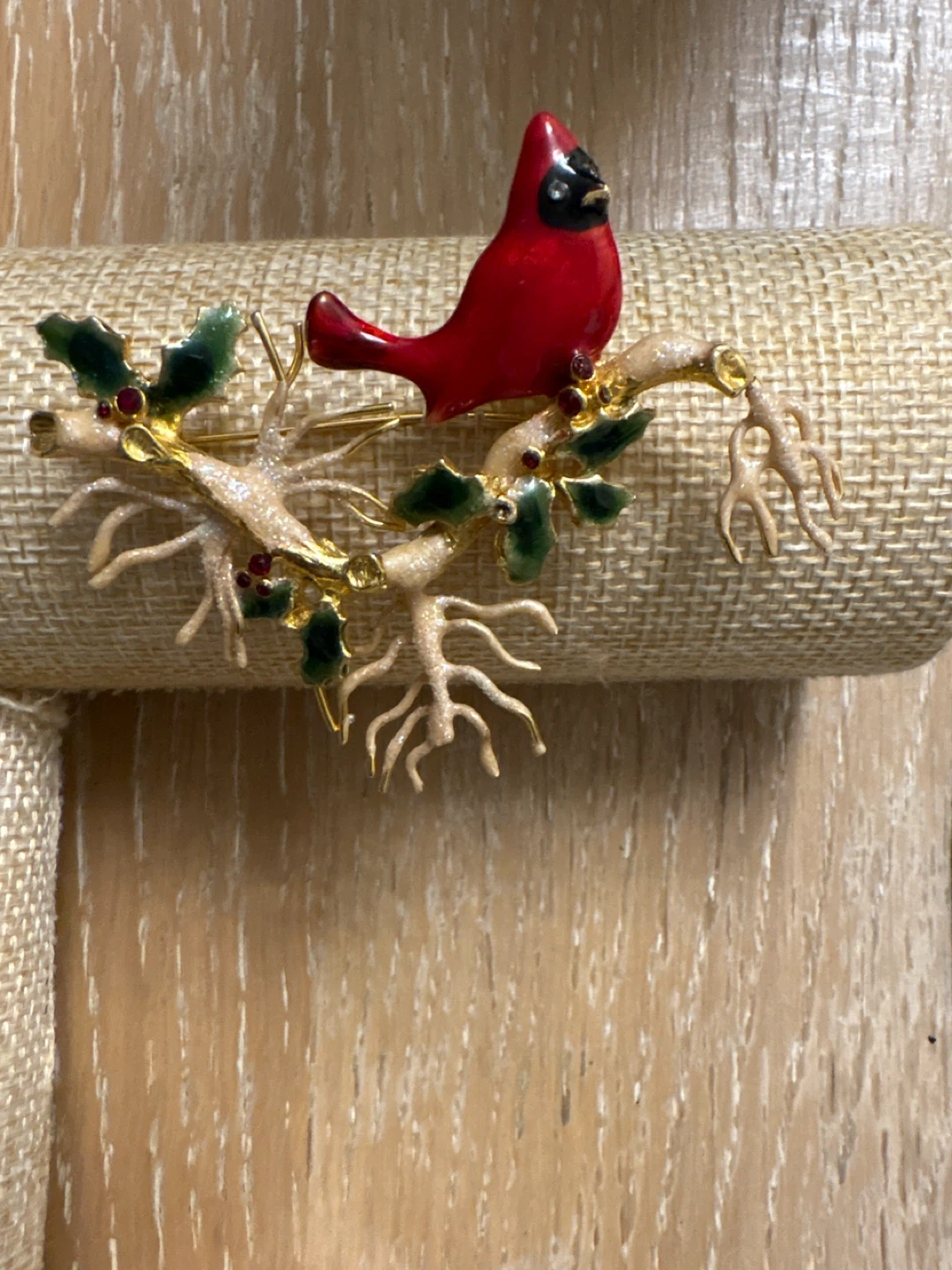 Selling a lovely cardinal bird brooch! It features a bright red cardinal perched on a branch with green leaves and red berries. Great for adding a festive touch to any outfit