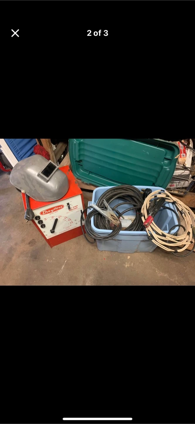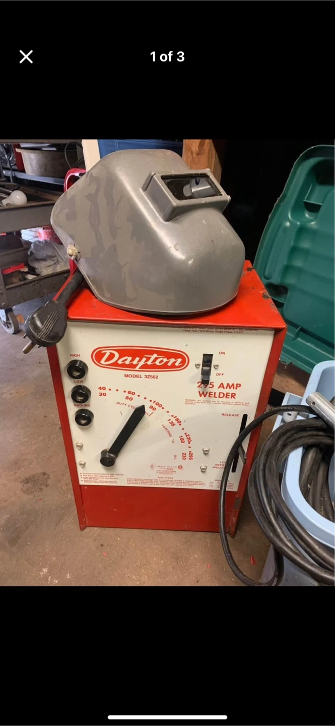 Selling a Dayton 225 AMP Welder. The model number is 3Z562. It comes with a welding helmet and cables.