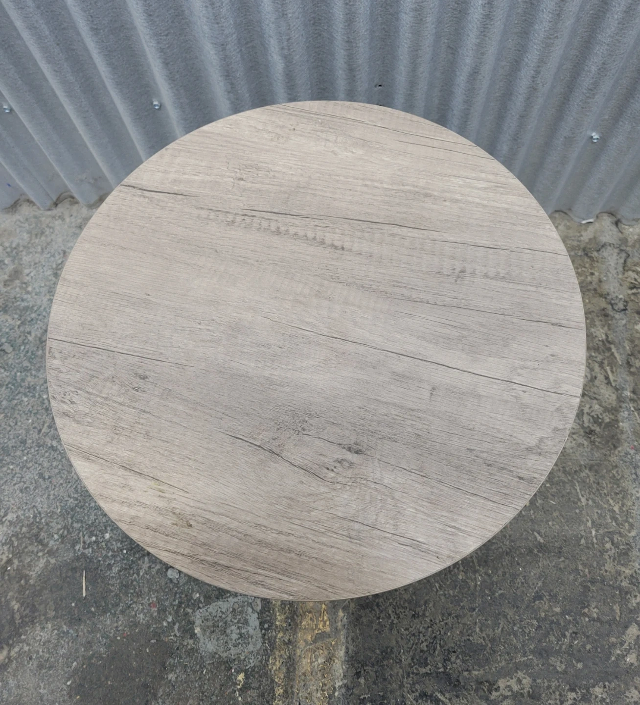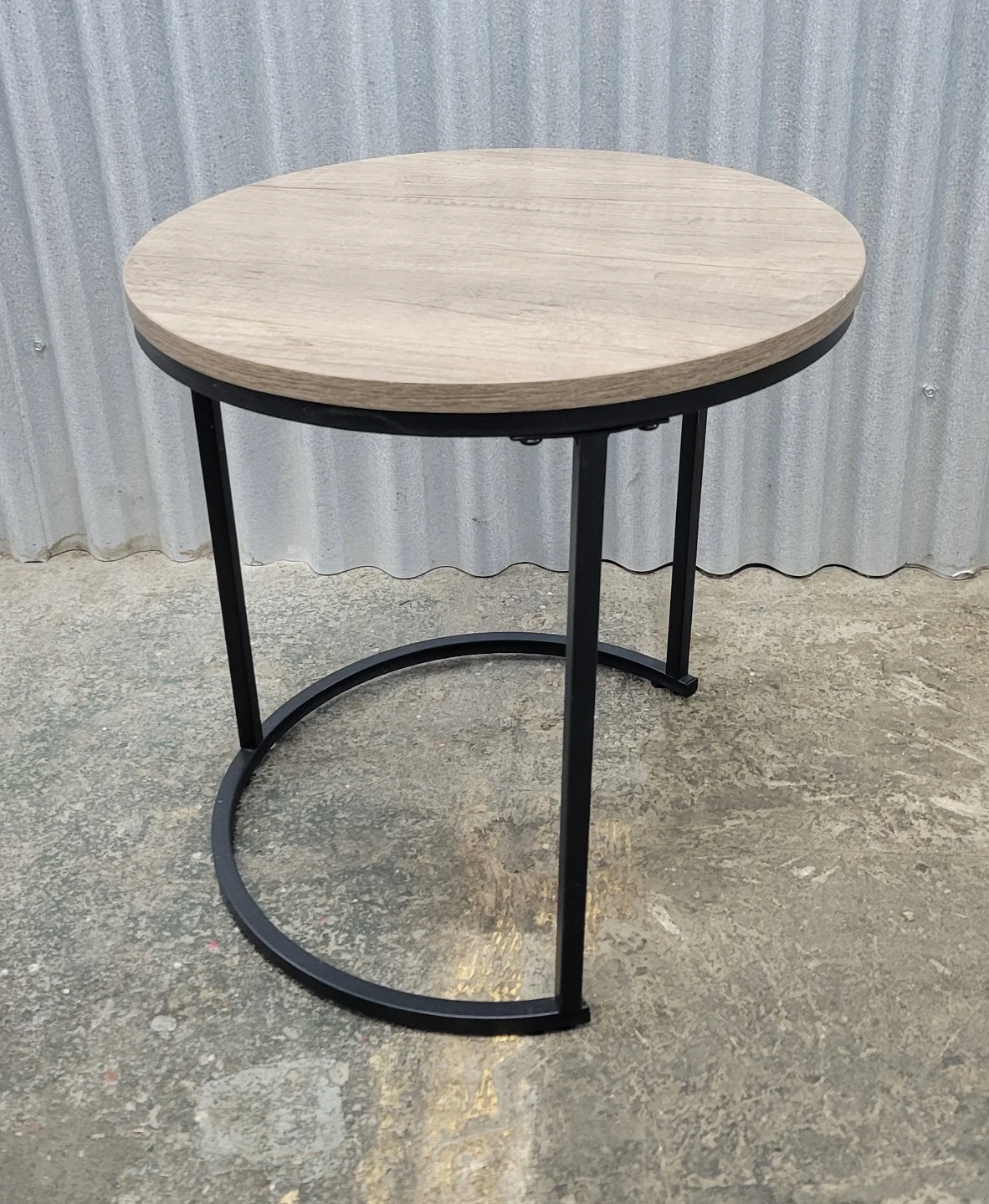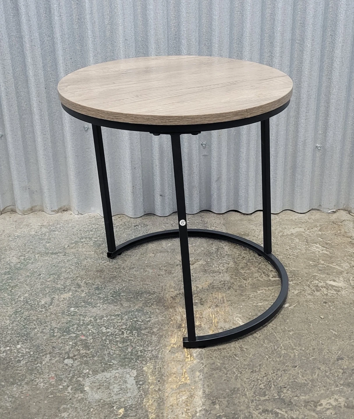 This round side table features a wood-look top and a sturdy black metal base. It's a versatile piece that works well next to a sofa or chair. The table's diameter is approximately 16 inches and its height is around 16,5 inches.