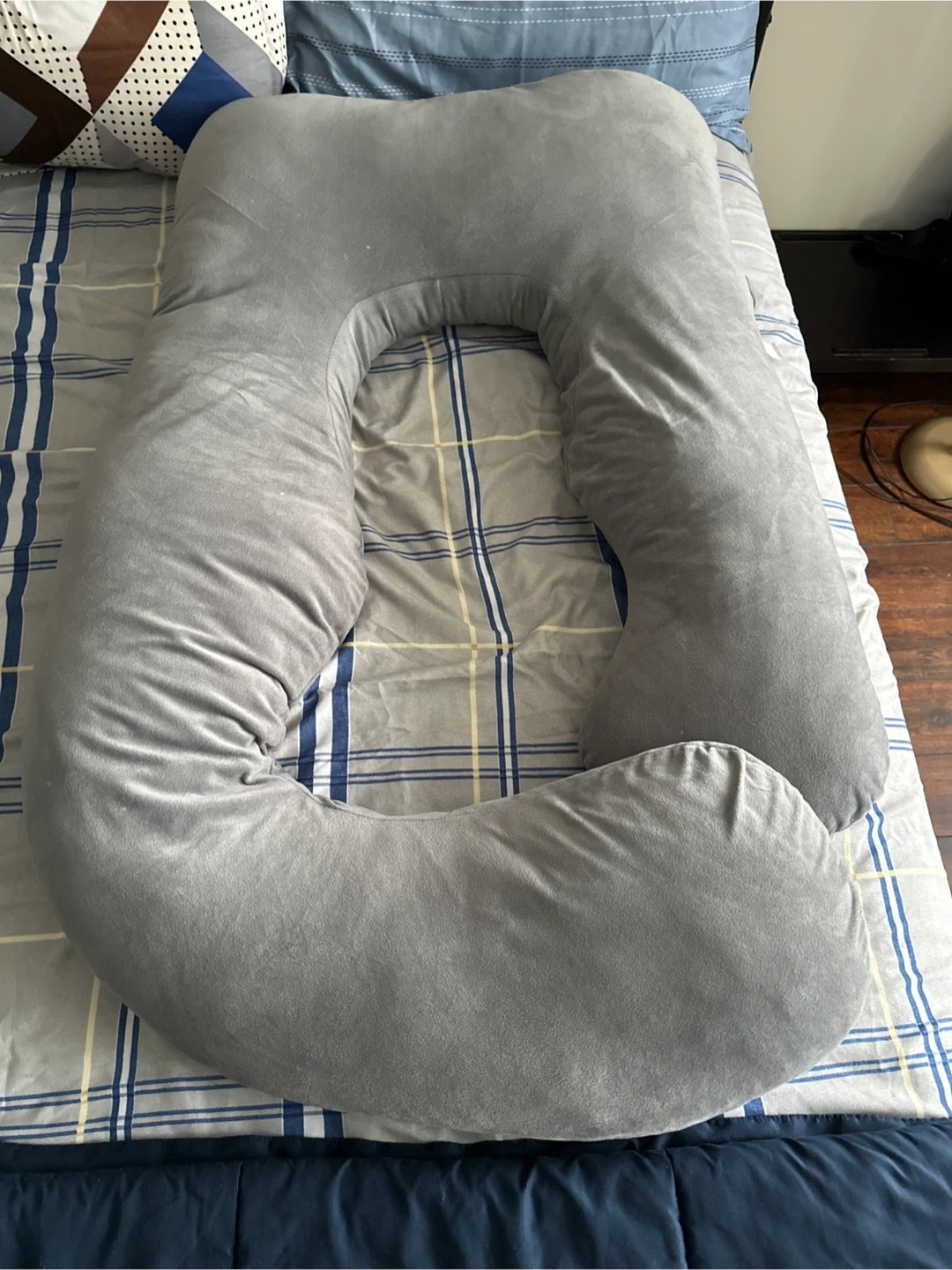 This U-shaped pillow provides full body support. It's covered in a soft, grey fabric. Great for sleeping and lounging!