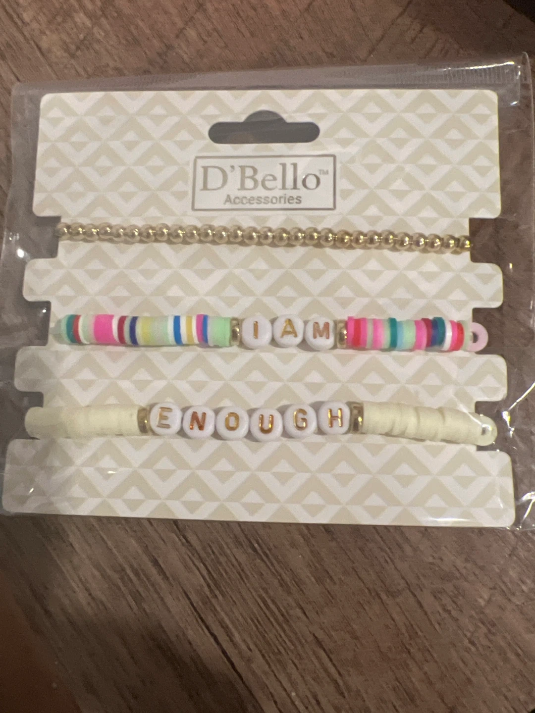 Selling a brand new D'Bello Accessories bracelet set! This set includes three cute bracelets: one with gold beads, one with colorful beads that says "I AM", and another with white beads that says "ENOUGH".