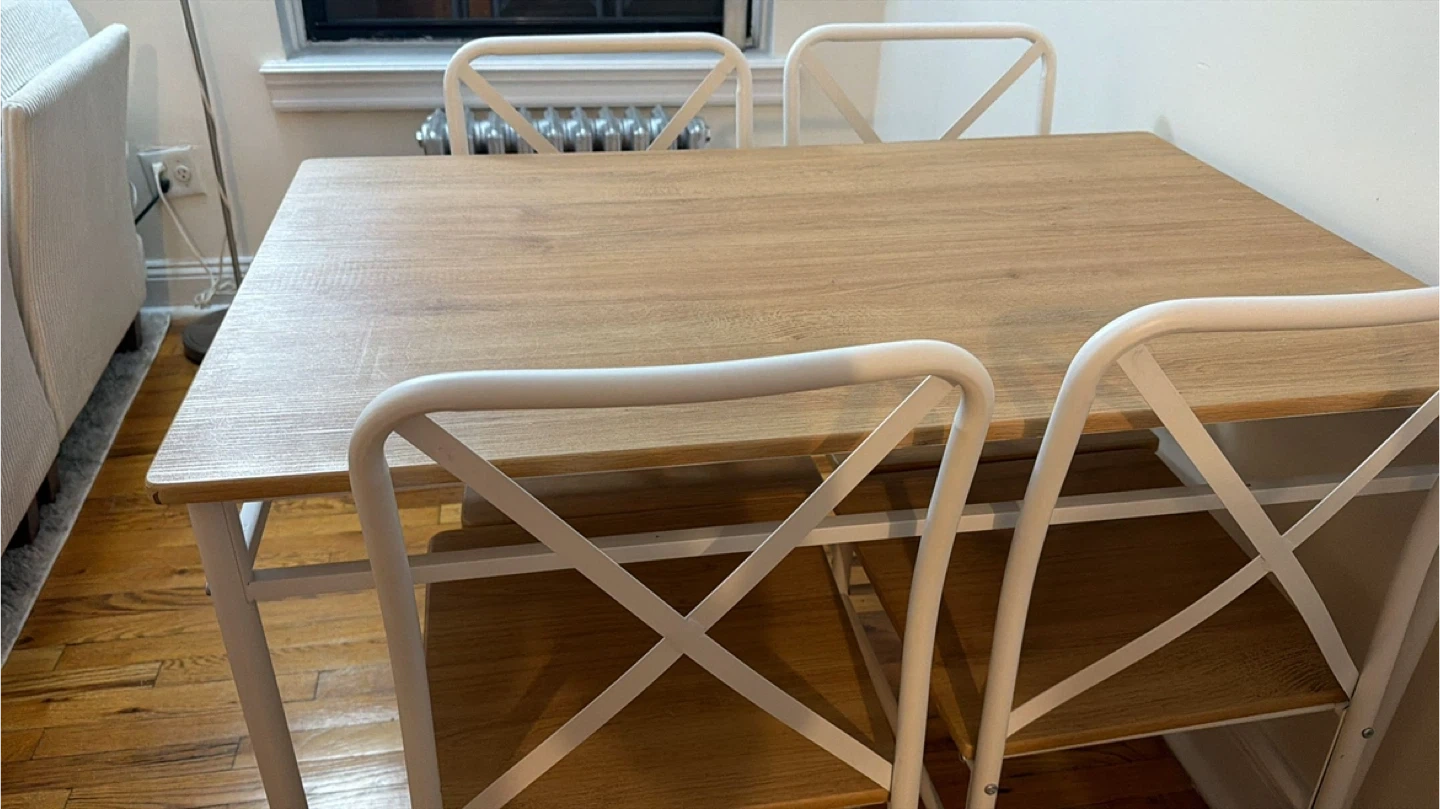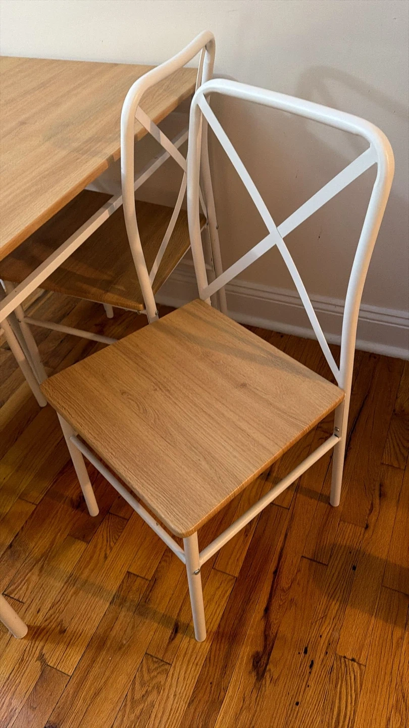 Selling a dining table with four chairs. The table has a light wood-colored top with white metal legs. The chairs are also light wood with white metal frames. Perfect for a small dining area or kitchen!