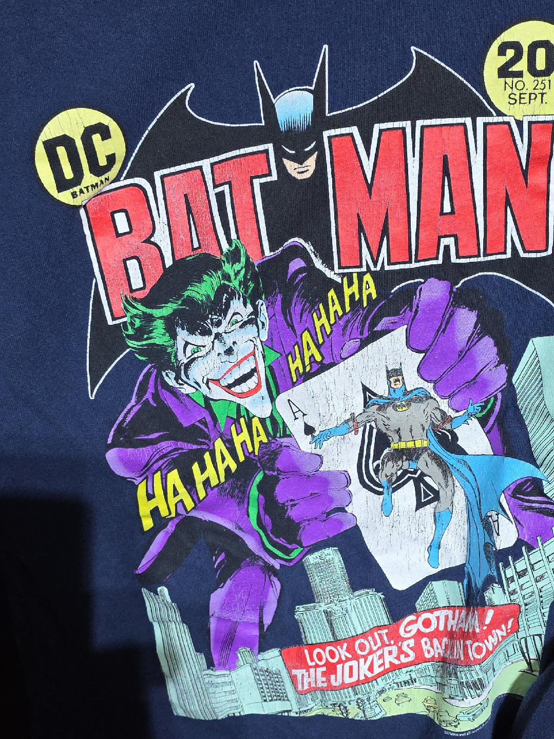 Here's a cool DC Batman T-shirt featuring the Joker! The graphic has a vintage comic book style with Batman and the Joker. Great for any fan of the Dark Knight!