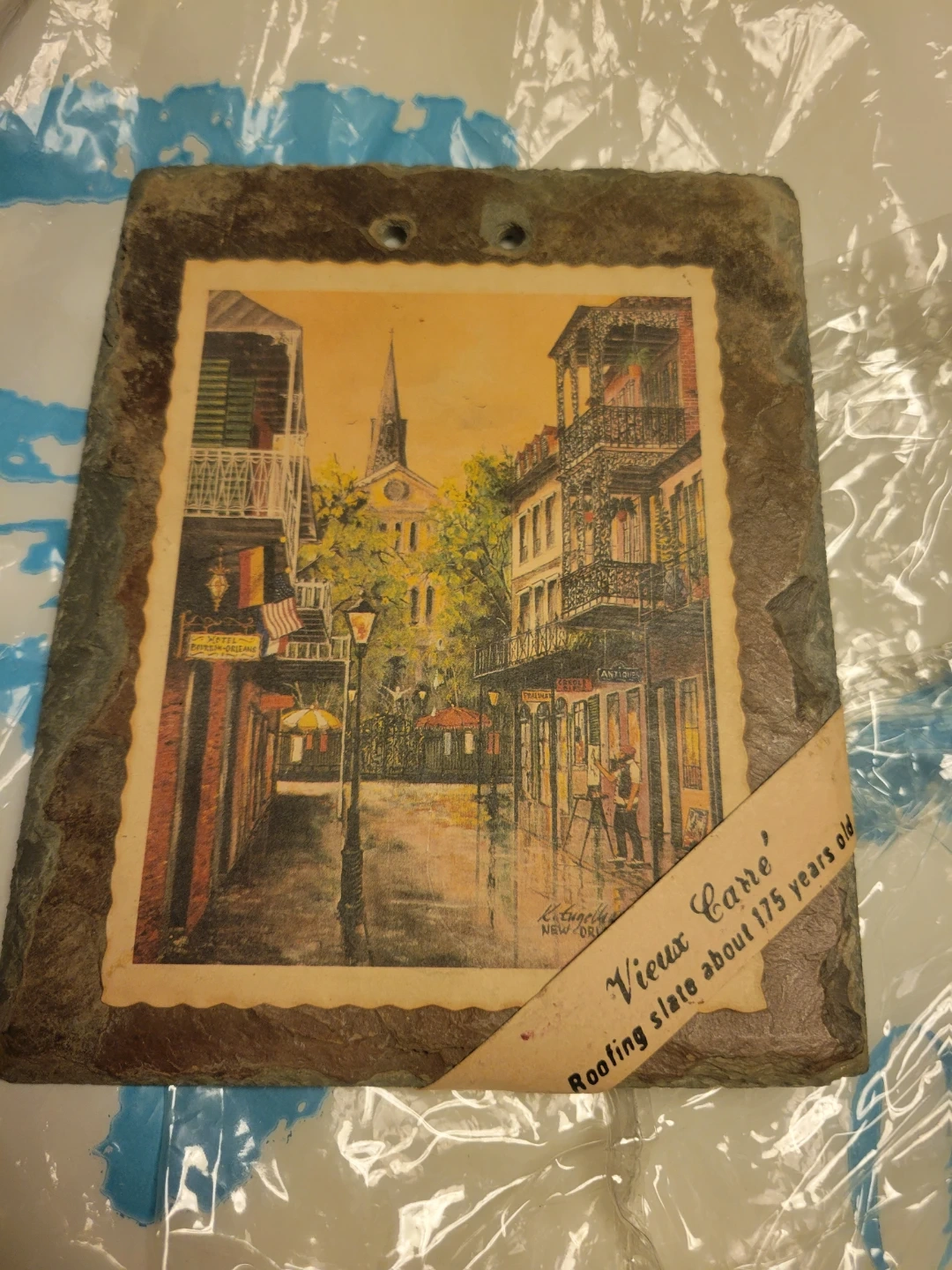 This is a unique piece of art made from a roofing slate tile. The image depicts Vieux Carré in New Orleans. The slate is about 175 years old and was mined in Pennsylvania and transported down the Ohio and Mississippi Rivers. It originally came from an old building in the Vieux Carré dating back to the 1800s