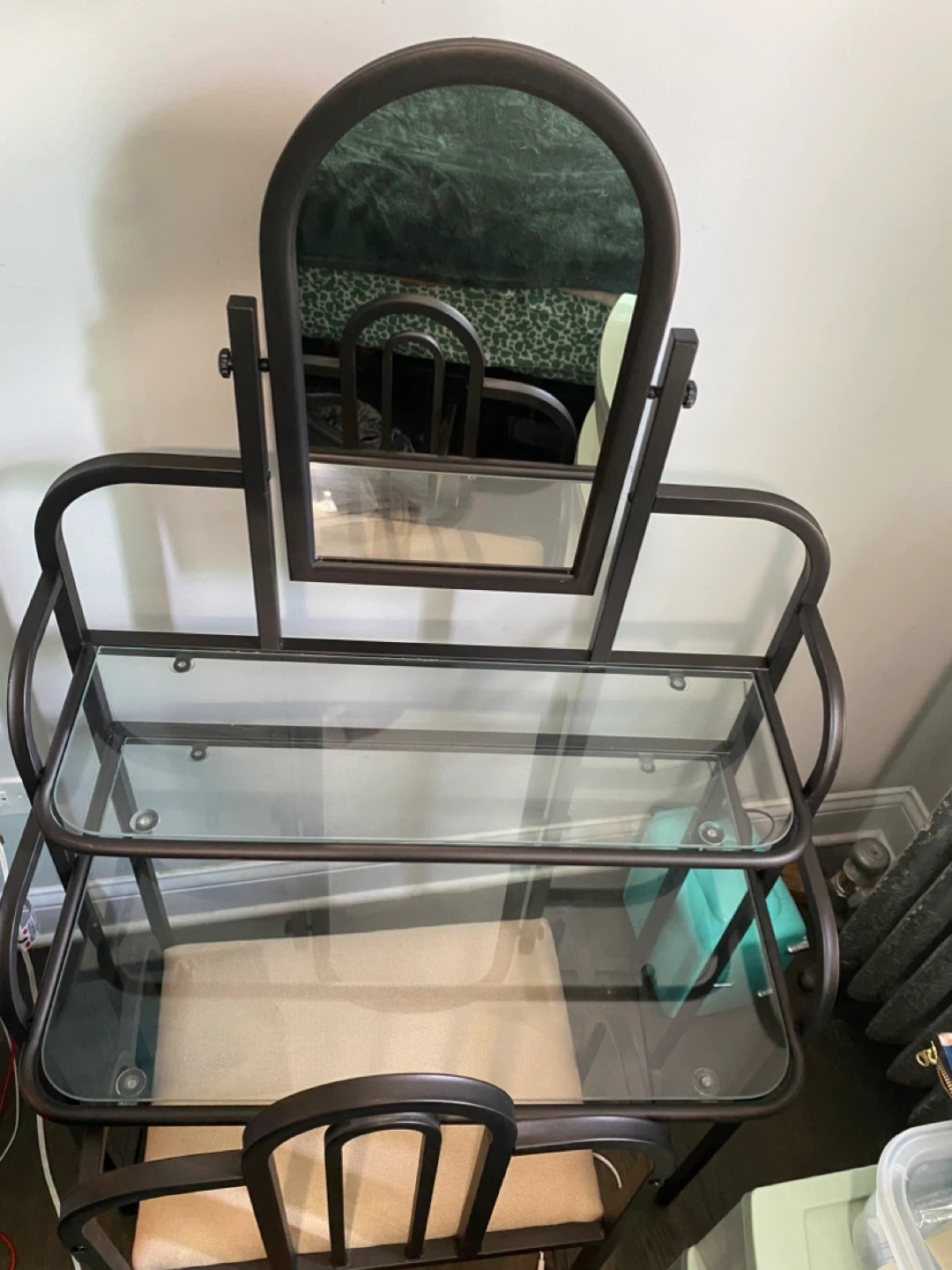 Selling a vanity table with a mirror and chair. It features a metal frame with tempered glass shelves and a cushioned seat. It's in good condition and would be a great addition to any bedroom/dressing area. The seat cushion has small very faint stain, which you can see in the last image.