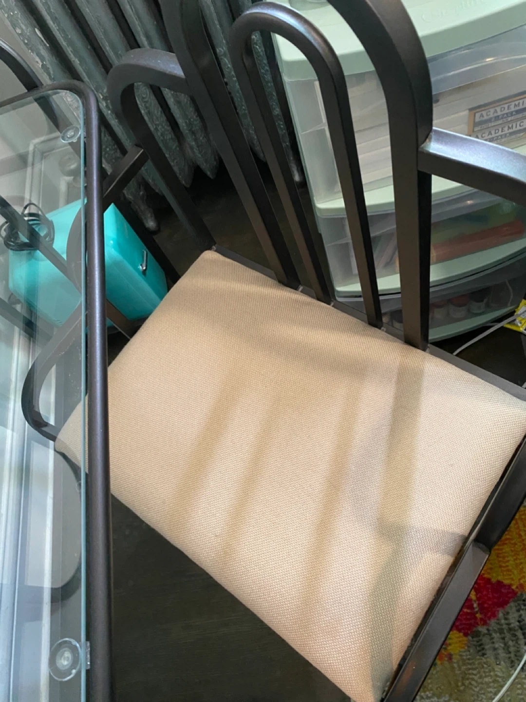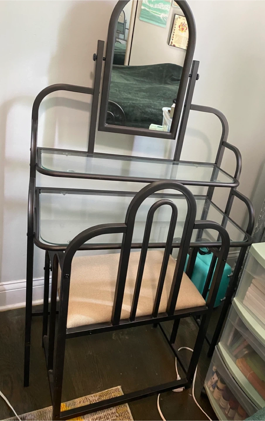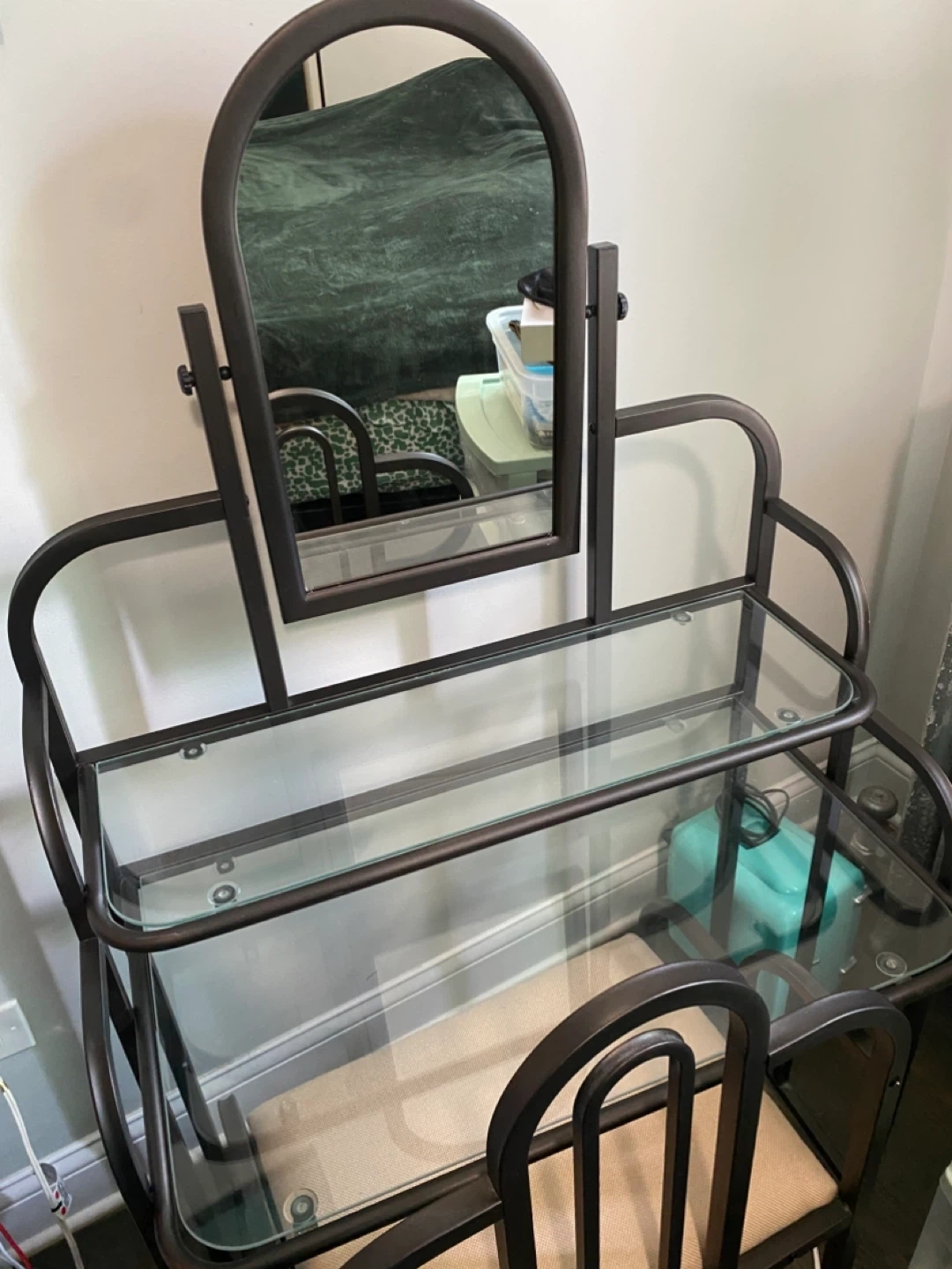 Selling a vanity table with a mirror and chair. It features a metal frame with tempered glass shelves and a cushioned seat. It's in good condition and would be a great addition to any bedroom/dressing area. The seat cushion has small very faint stain, which you can see in the last image.