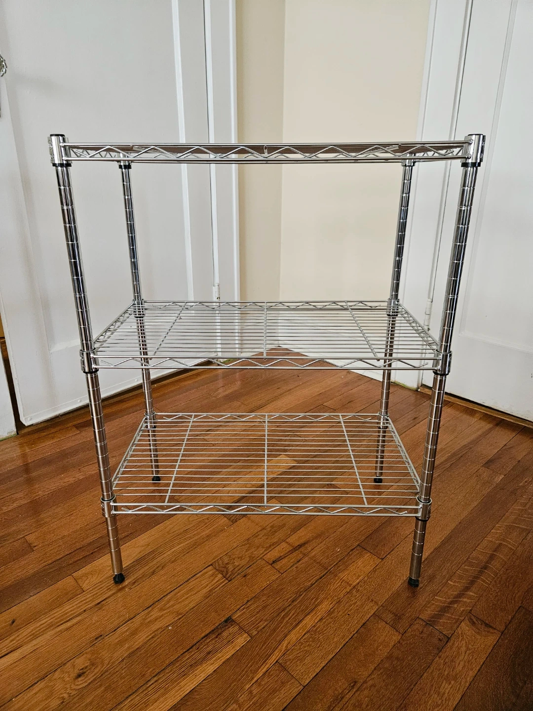 Chrome wire shelving unit with three shelves. It's a sturdy metal rack perfect for organizing storage space. Unit dimensions are approximately 18" W x 14" D x 30" H.