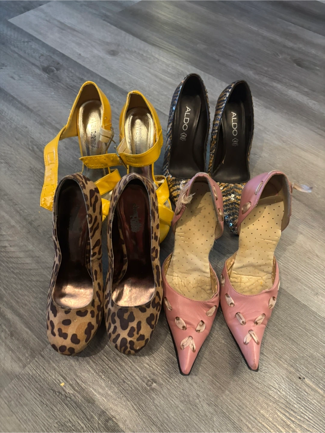 Selling a collection of heels, including a pair from Aldo. There's a yellow pair and a leopard print pair too. They're in used condition.