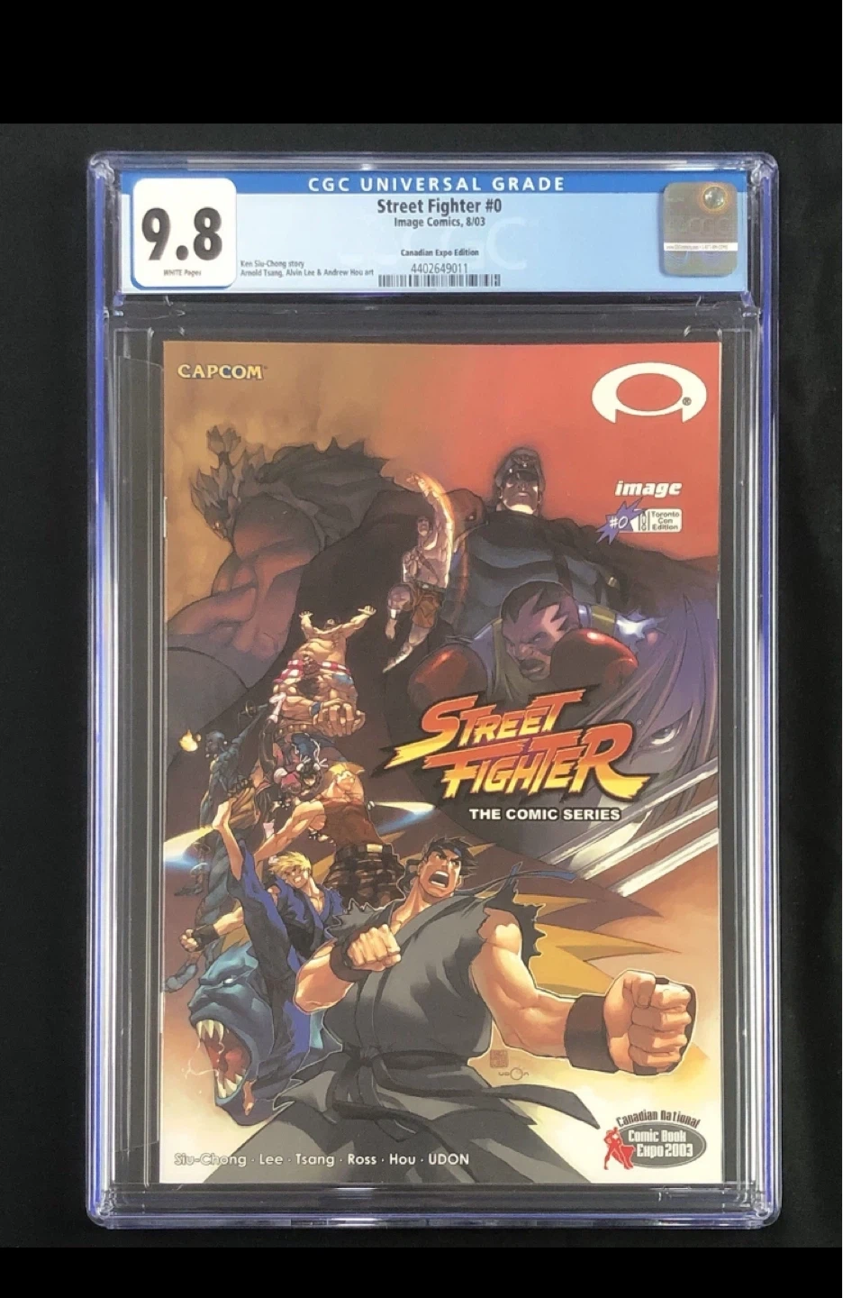 This is Street Fighter #0, a comic from Image Comics, released in August 2003. It's a CGC Universal Grade with a 9.8 rating. This is the "Canadian Expo Edition", a variant cover. It comes in a protective case.