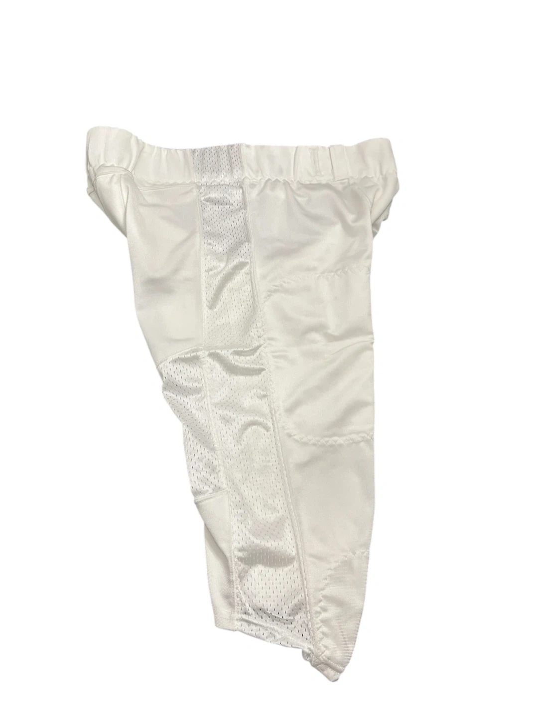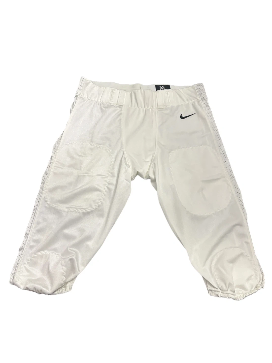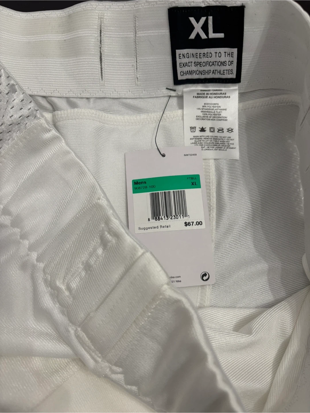 These Nike football pants are white and size XL. They're made with 86% polyester and 14% spandex. Reinforced padding throughout.