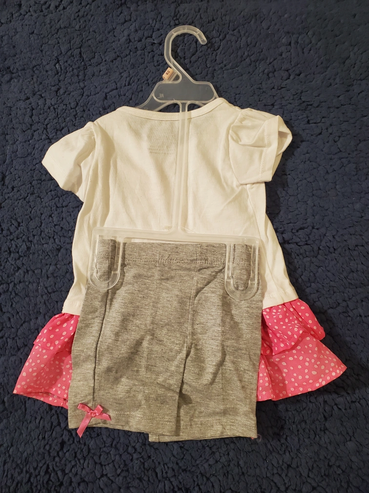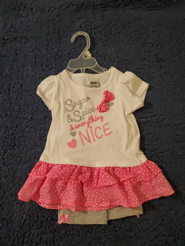 Adorable baby girl outfit from 100% Cuties! This cute set features a white top with a "Sugar & Spice & everything NICE" design, a pink polka-dot ruffled skirt, and gray shorts with little bows. Perfect for your little one!