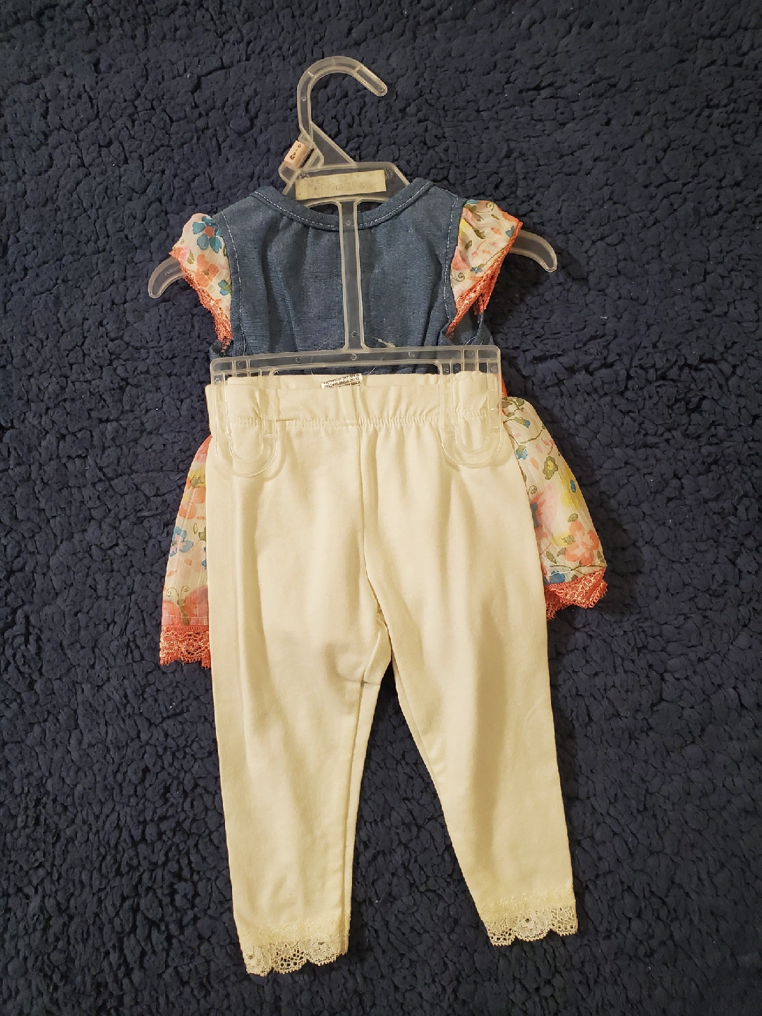 65Cute DDG Darlings baby outfit with a denim-look top and floral skirt, paired with white leggings. The outfit is brand new and ready for a new little one!