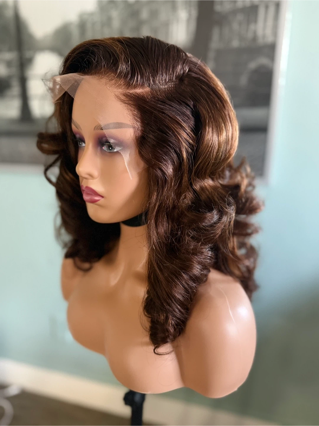 Beautiful brown wig with loose waves and subtle highlights. It features a lace front for a natural hairline. The hair is soft and has a nice sheen.