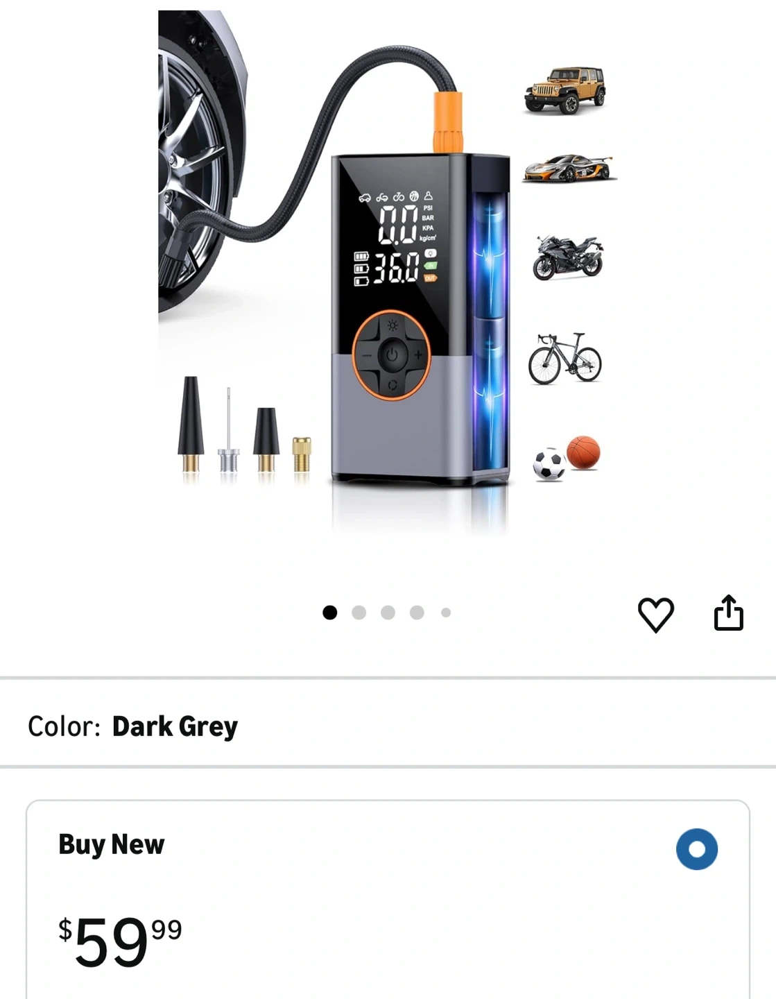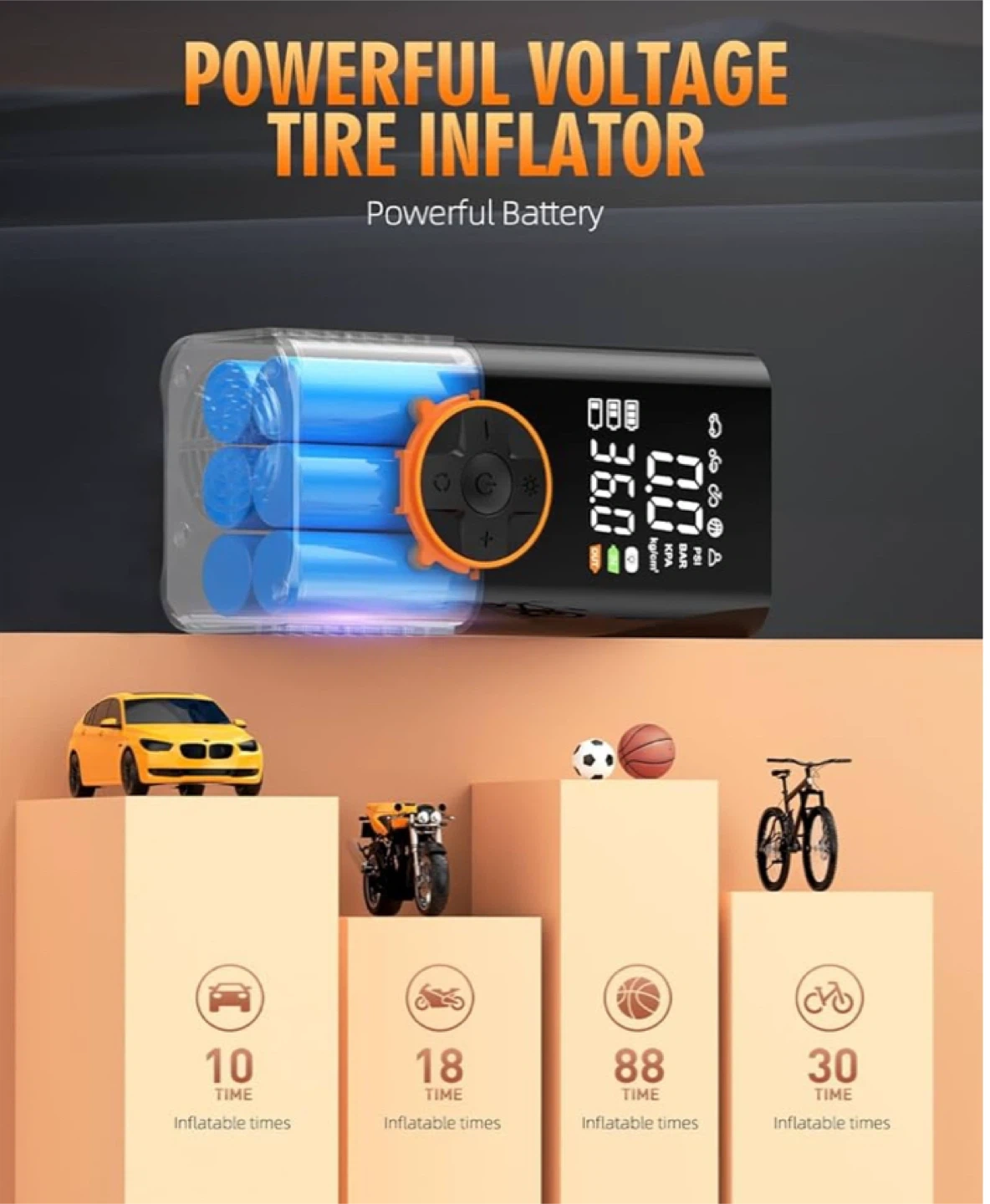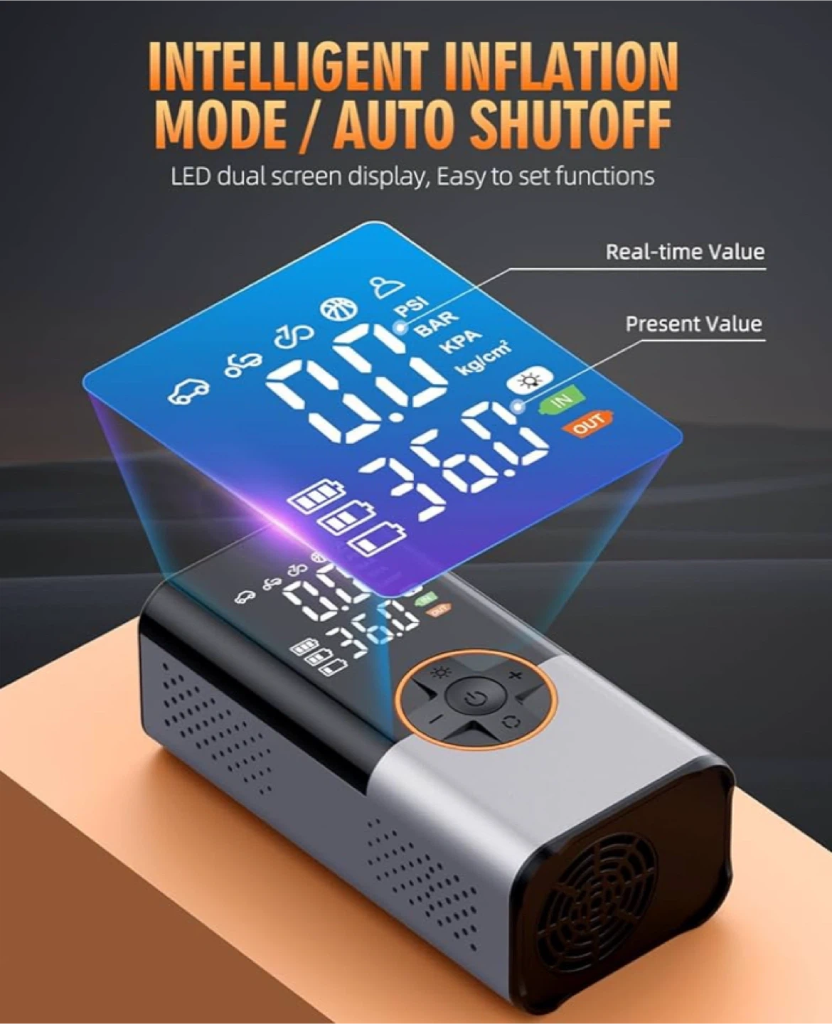 【4+N Smart Modes】The tire inflator portable air compressor supports 4 pressure measurement units: PSI, KPA, BAR, and kg/cm². It features four preset modes: bicycles, motorcycles, cars, and balls. An additional manual mode lets you set custom pressure values based on your inflation needs. Adding convenience to daily life and trips