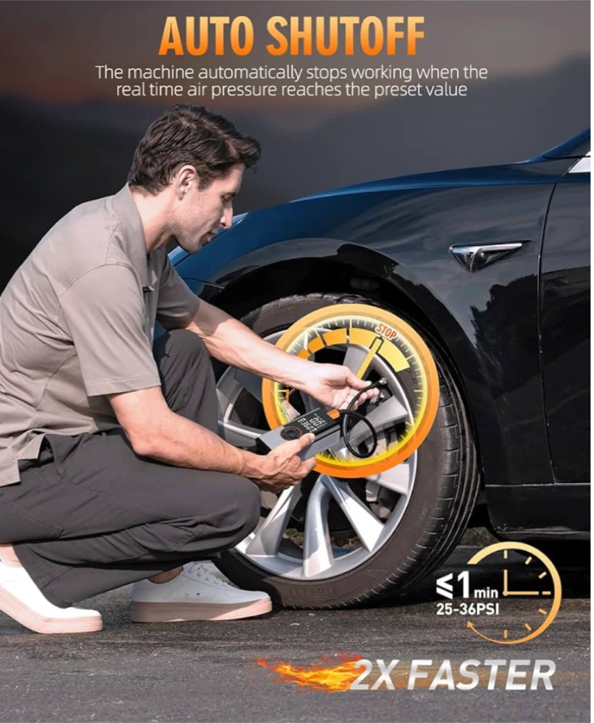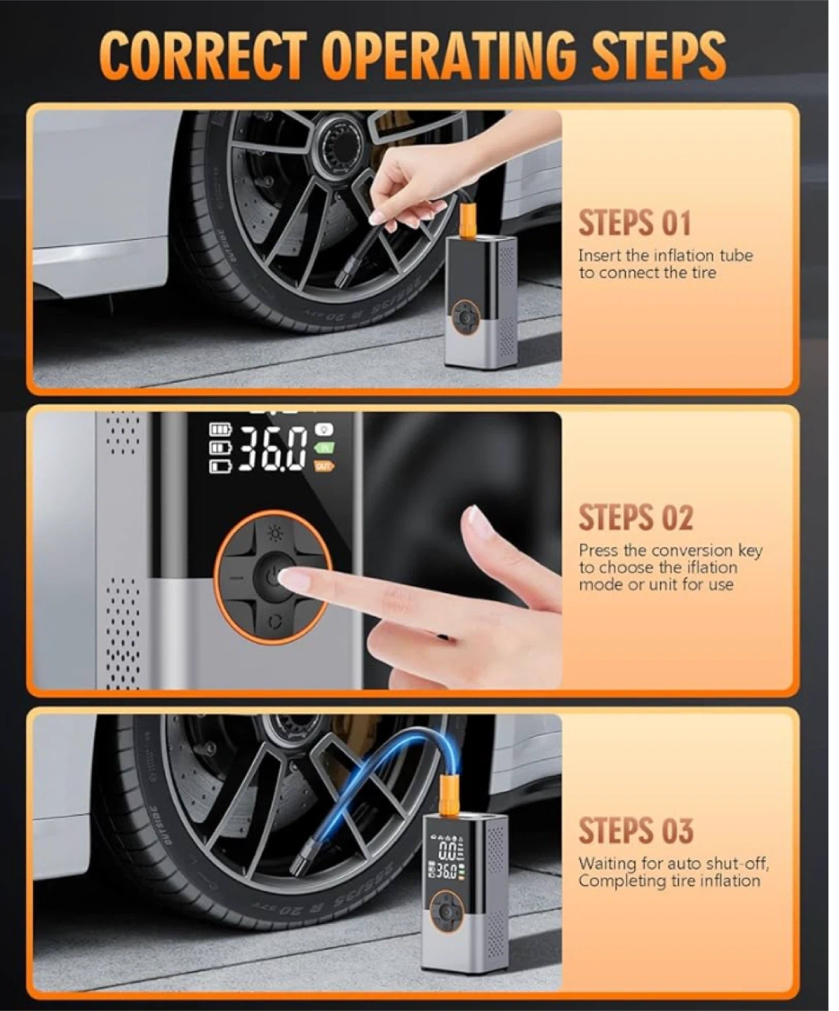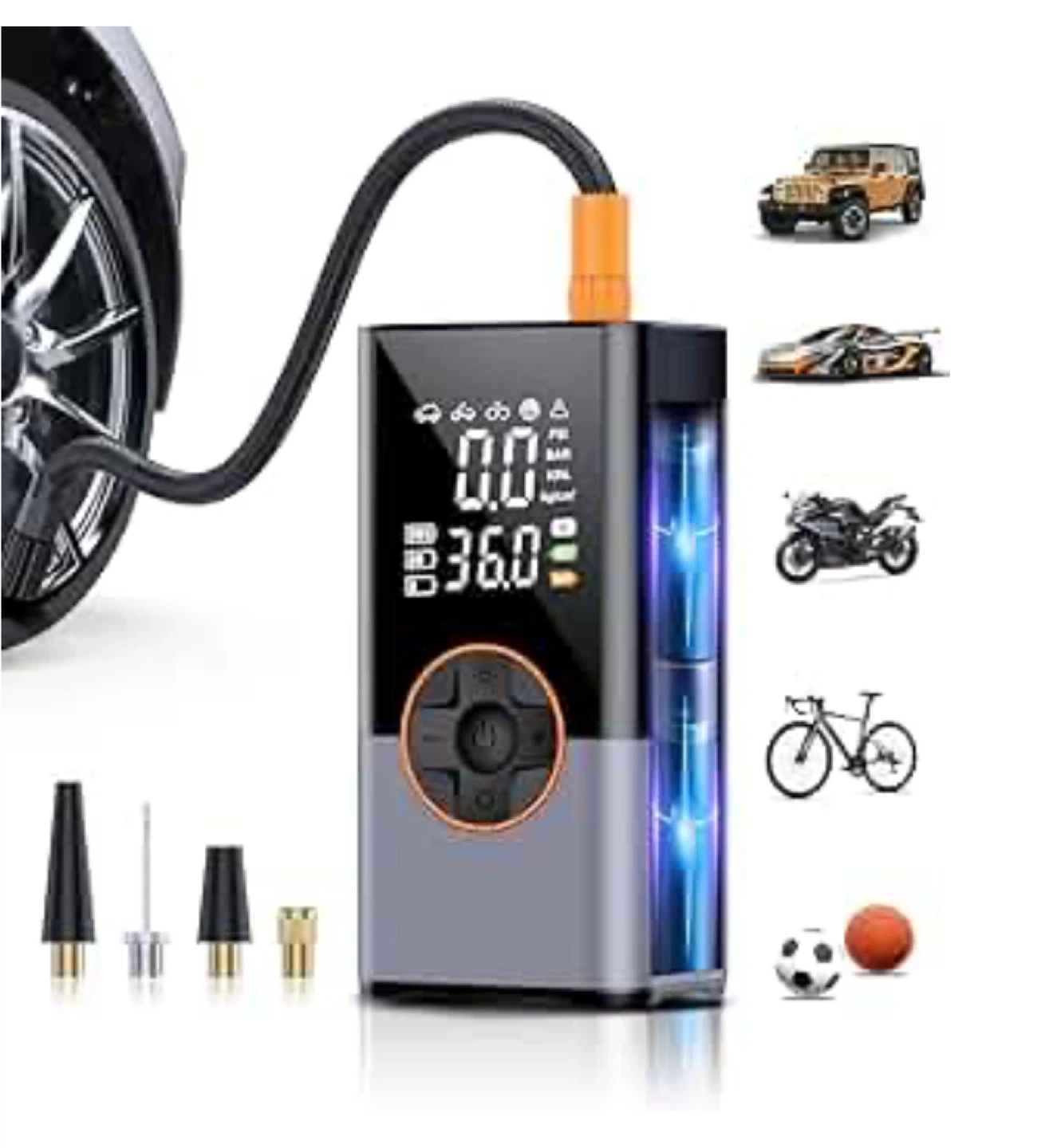 portable air compressor is equipped with a high-performance chip that generates a powerful, high-speed airflow. Its inflation rate delivers an impressive 36L/min, twice as fast as standard tire inflators. It can quickly inflate your tires, reaching a maximum pressure of 150 PSI