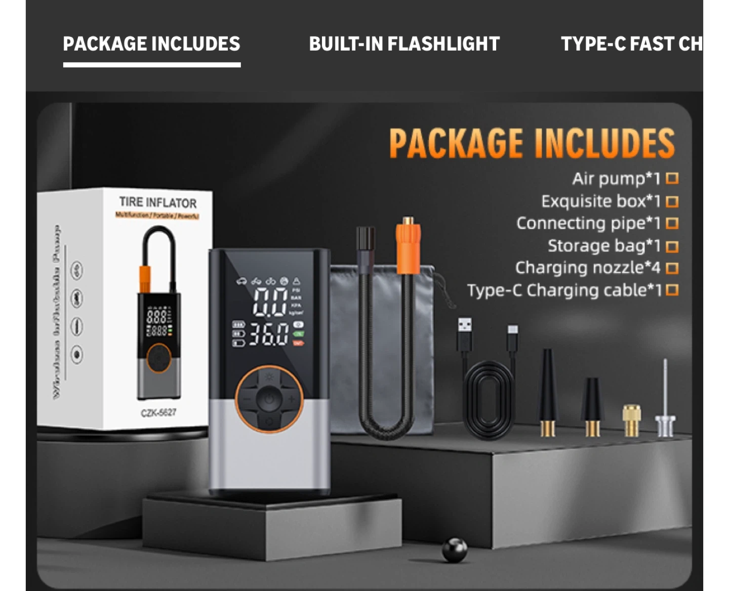 【Multifunctional Emergency Tools】In addition to serving as a tire inflator, it is also a versatile emergency tool. It features an LED light with 3 modes at the top, for illuminating dark areas or warn other vehicles at night. There’s also a 5V/2A USB output/input port, allowing it to serve as an emergency power source for electronic devices