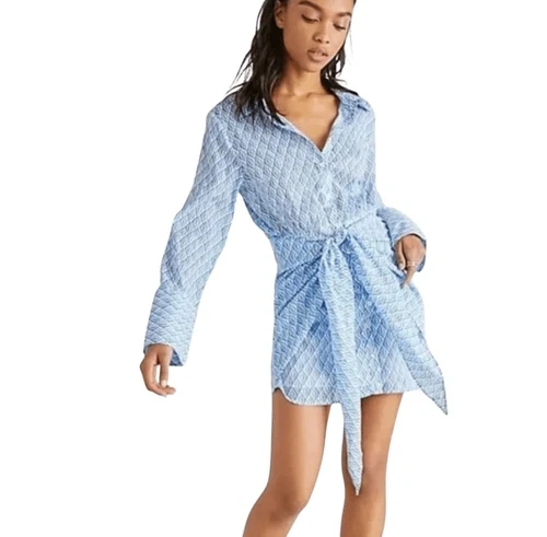 Perfectly printed in a timeless design, this essential mini dress is featured in a button-front silhouette with exaggerated front tie detail for added shape. Long sleeve design. Classic collar detail. Fully lined design.