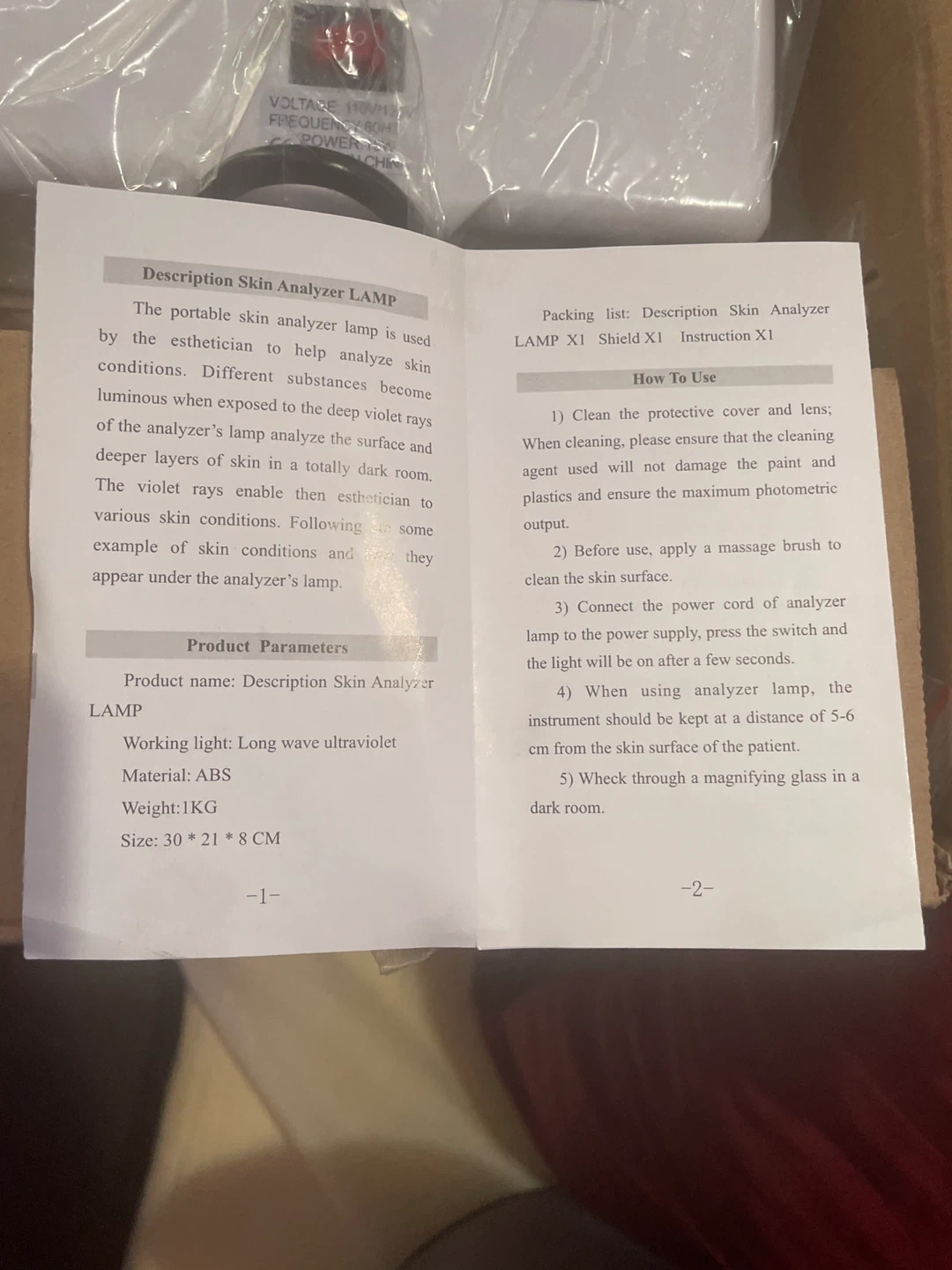 The portable skin analyzer lamp is used by the esthetician to help analyze skin conditions. It comes with the lamp, shield, and instruction manual. The product parameters include that it uses long wave ultraviolet working light, is made of ABS material, weighs 1 kg, and is size 30 * 21 * 8 cm