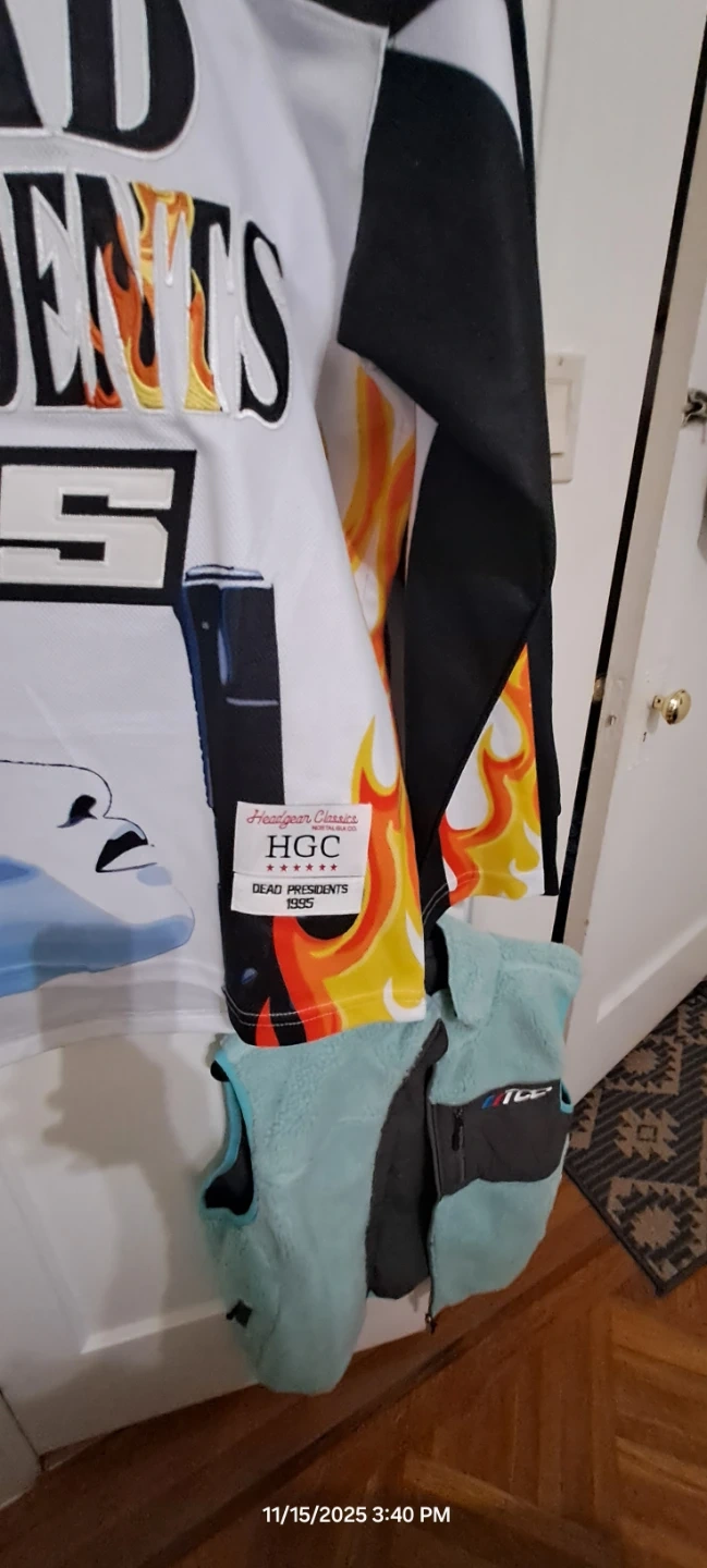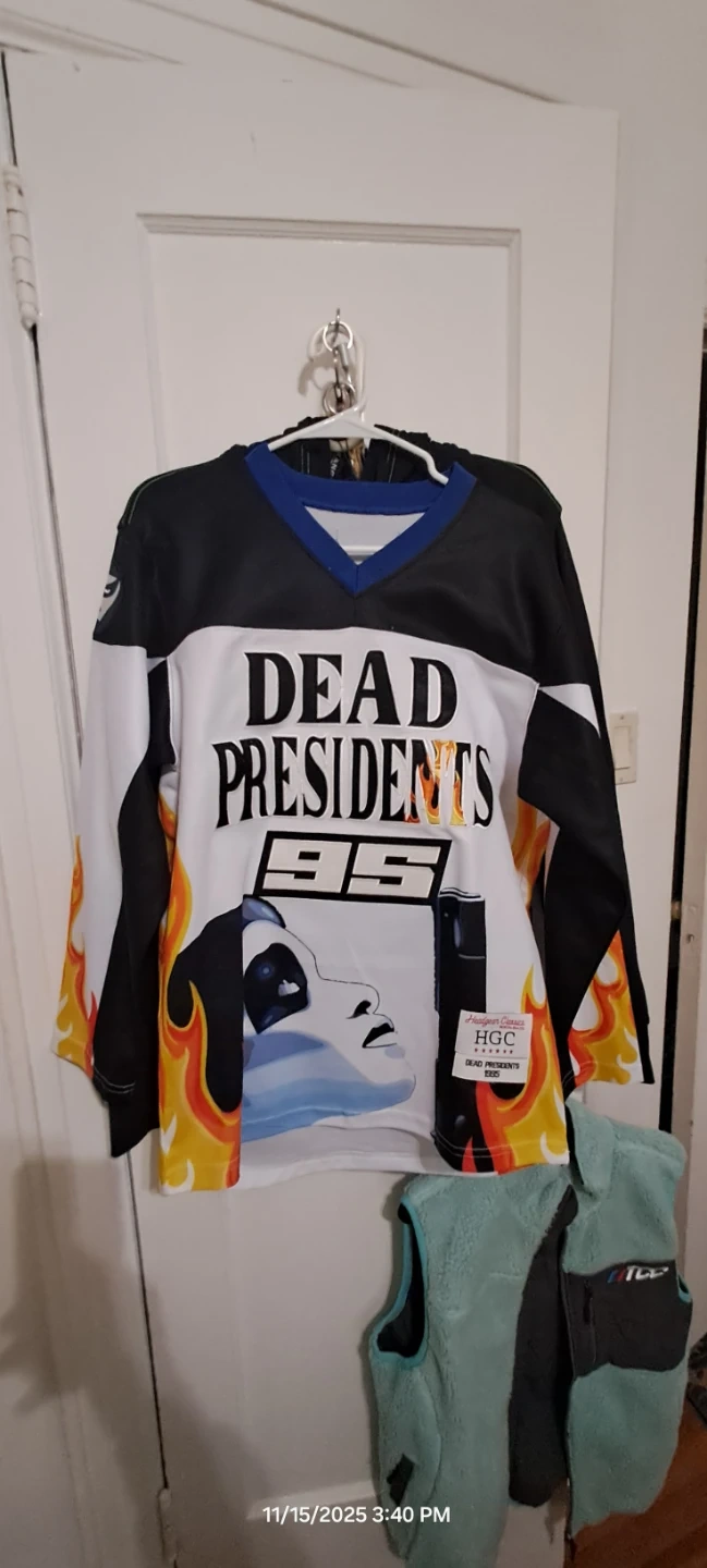 65Selling a Dead Presidents 95 hockey jersey with a unique design. It features flame accents and bold lettering. Perfect for fans or collectors!