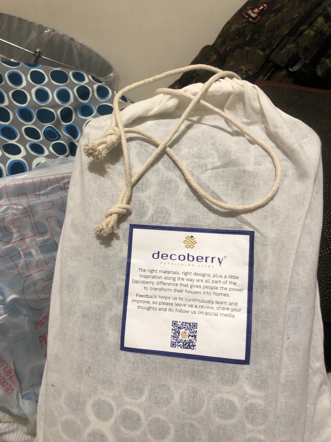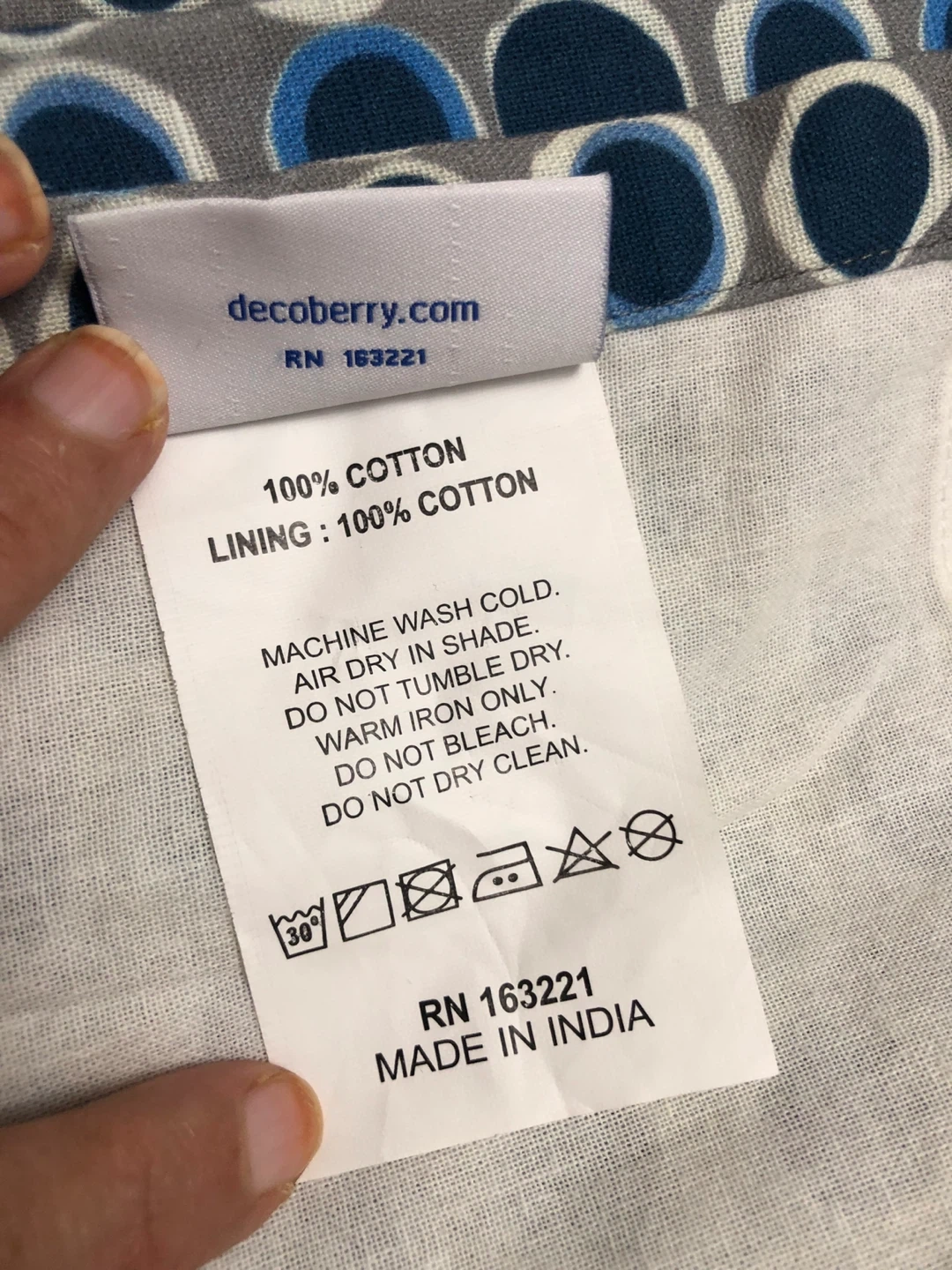 I'm selling a set of Decoberry curtains. They feature a fun blue and gray circular pattern. The material is 100% cotton. They are in great condition and come in their original bag!