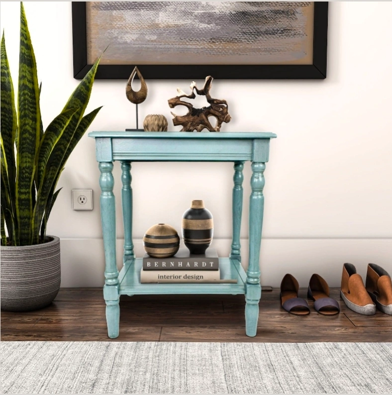 81This is a cute accent table that would look great in any room! It features a lower shelf for extra storage or display. The table is a blue/gray color and measures approximately 15.75" x 19.5" x 24".