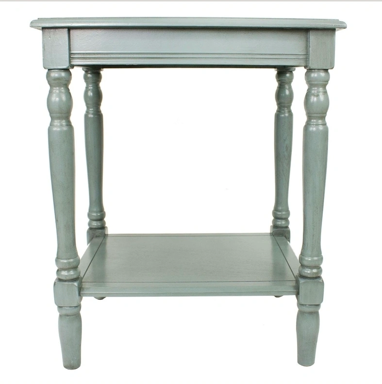 81This is a cute accent table that would look great in any room! It features a lower shelf for extra storage or display. The table is a blue/gray color and measures approximately 15.75" x 19.5" x 24".