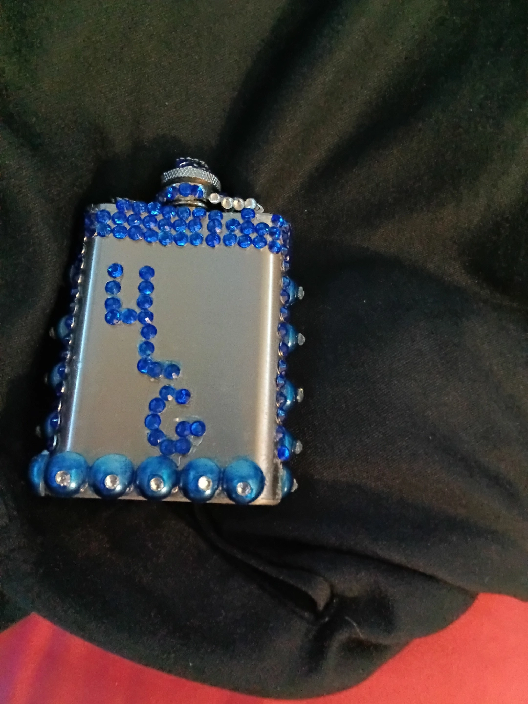 This is a decorated hip flask with blue stones and jewels. It is in good condition.