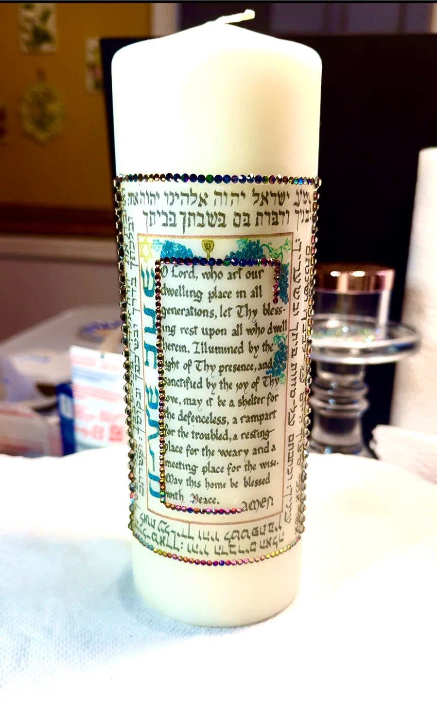 15This is a decorated Hamsa home blessing customized candle with Swarovski rhinestones and religious content. It would make a lovely addition to any home