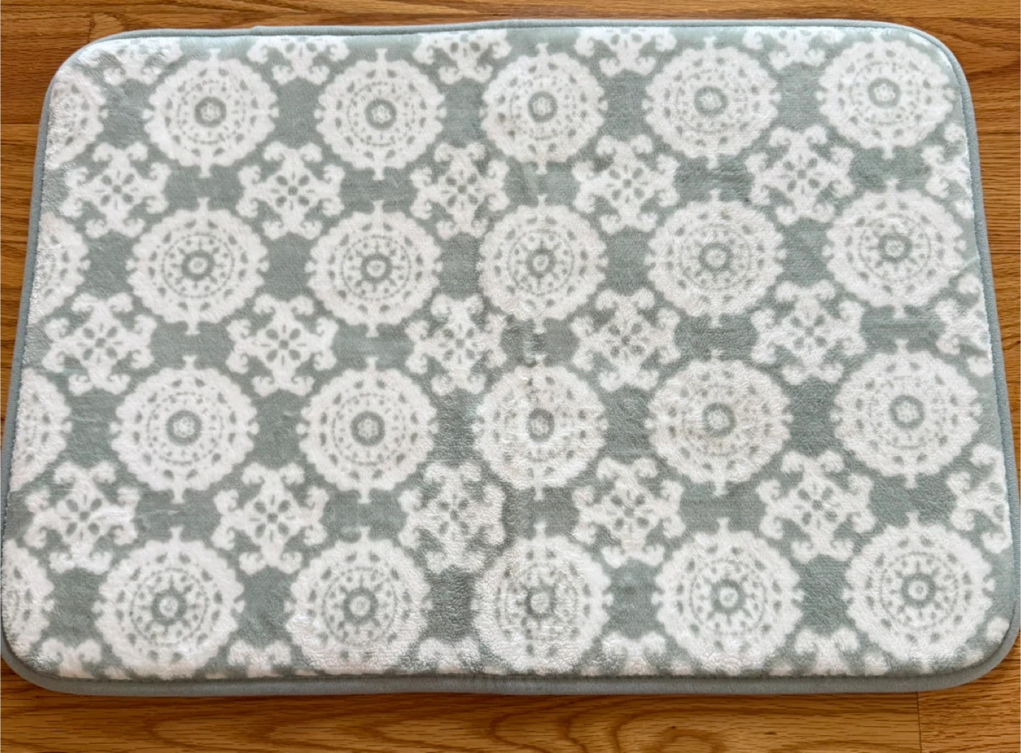 Here's a soft and decorative bath mat to add a bit of style to your bathroom It features a pretty gray and white pattern It’s brand new never used but bought a while ago so the bottom surface did turn yellowish. Extremely soft and comfy for the top surface.