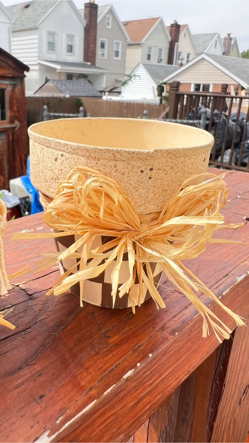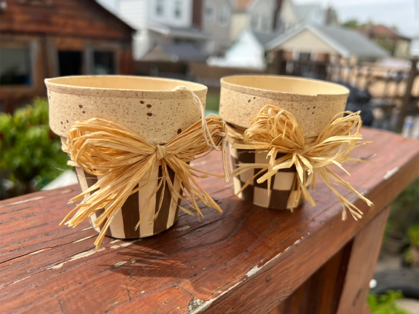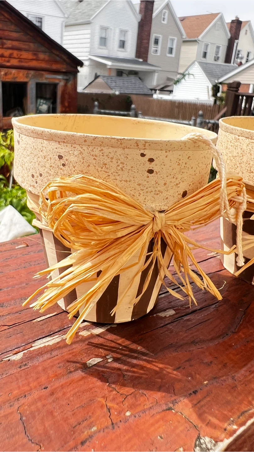 32I'm selling a pair of decorative candle holders. They have a speckled, neutral-toned finish on the top portion and a striped or checkered pattern on the bottom. Each one is adorned with a raffia bow, adding a touch of rustic charm to any space
