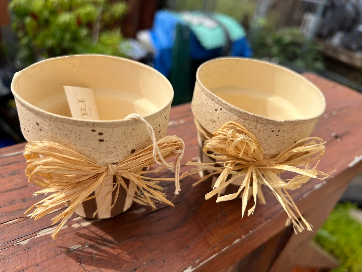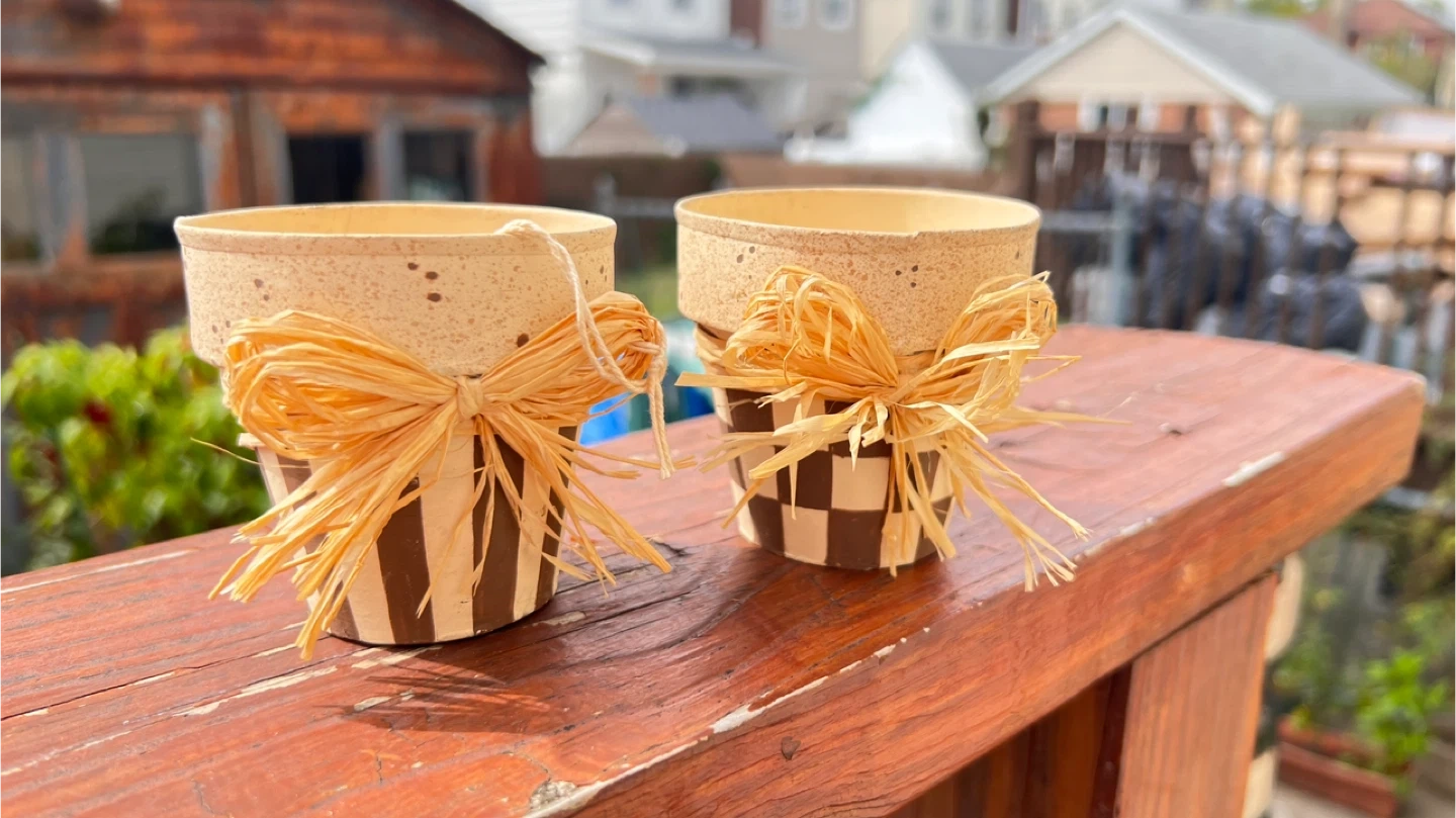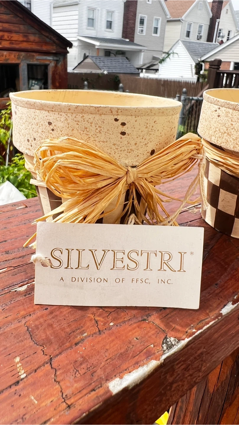 32I'm selling a pair of decorative candle holders. They have a speckled, neutral-toned finish on the top portion and a striped or checkered pattern on the bottom. Each one is adorned with a raffia bow, adding a touch of rustic charm to any space