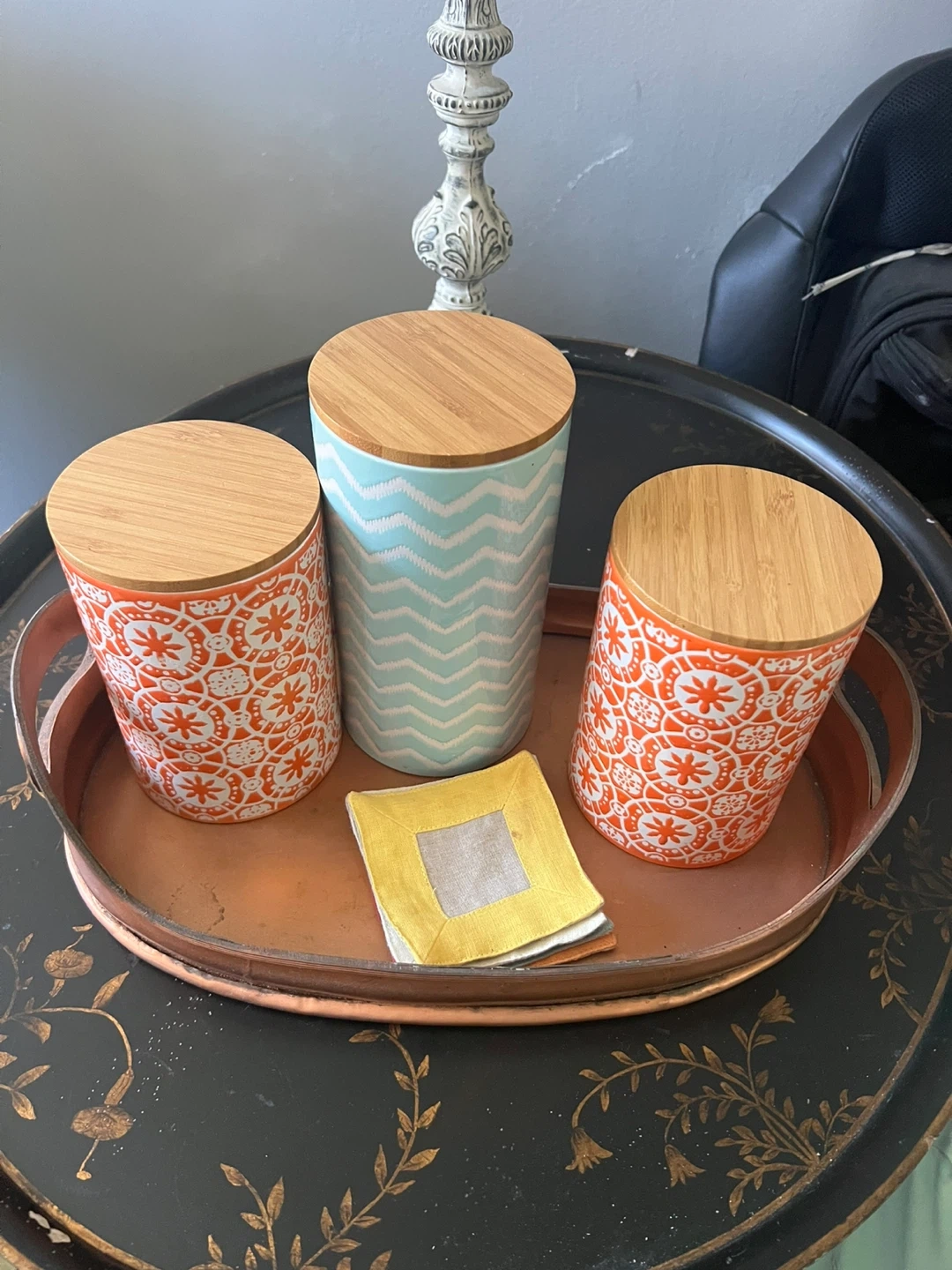 Selling three decorative canisters with bamboo lids. Two have an orange floral pattern, and one has a light blue zigzag pattern. They're perfect for adding a touch of style to your kitchen or pantry!