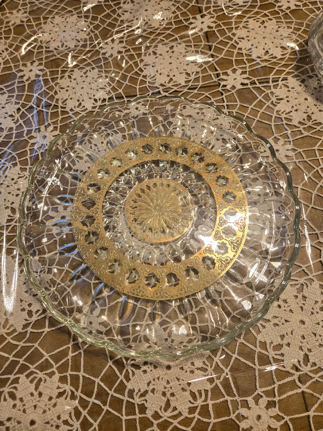 60Selling a decorative clear glass plate featuring a beautiful gold accent design in the center. It would make a lovely addition to any table setting or display 22k gold