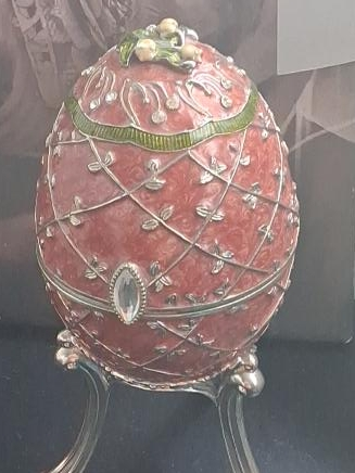 This is a beautiful decorative egg figurine. It features an intricate design with floral accents and a lovely color. It would make a great addition to any collection or as a standalone decorative piece