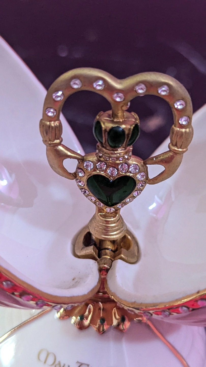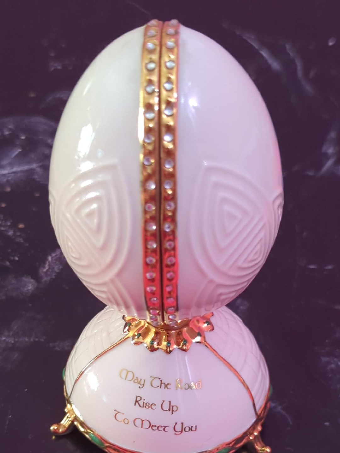 This is a beautiful, musical trinket box in the shape of an egg. It features gold accents and rhinestones. The base reads: "May The Road Rise Up To Meet You". The box opens to reveal a small compartment, perfect for storing jewelry or other small treasures