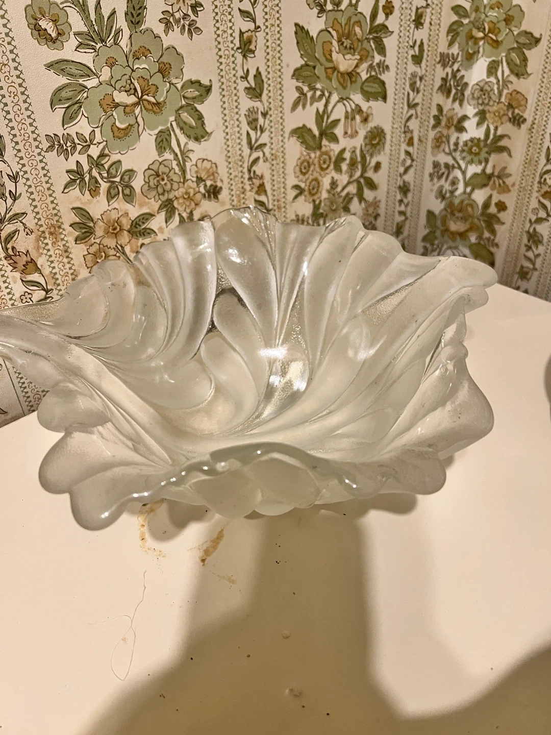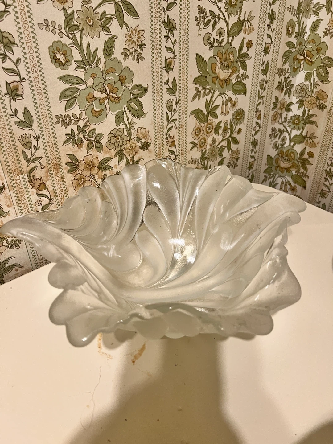 110Selling a decorative glass bowl. It's a beautiful piece to add to any room! The bowl has a unique leaf-like design. Perfect for holding fruit or as a centerpiece on your table