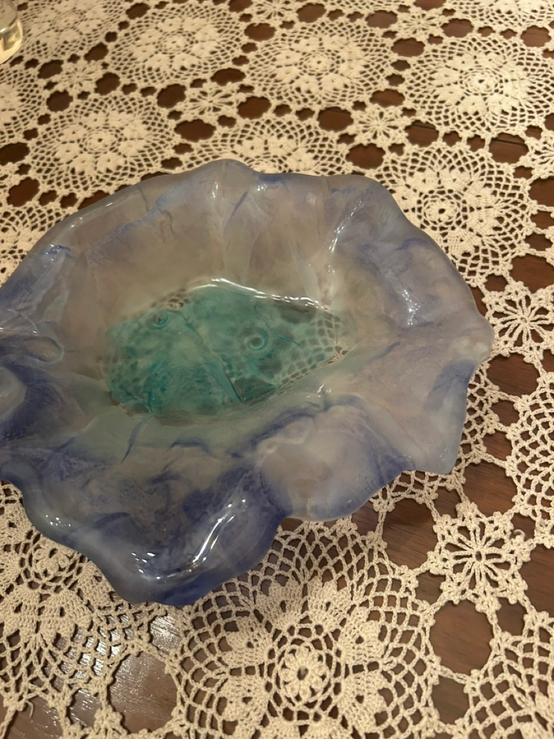 10Selling a beautiful decorative glass bowl! It features a lovely combination of blue and white colors. The bowl has a unique, wavy edge design. It would make a great centerpiece or accent piece for your home