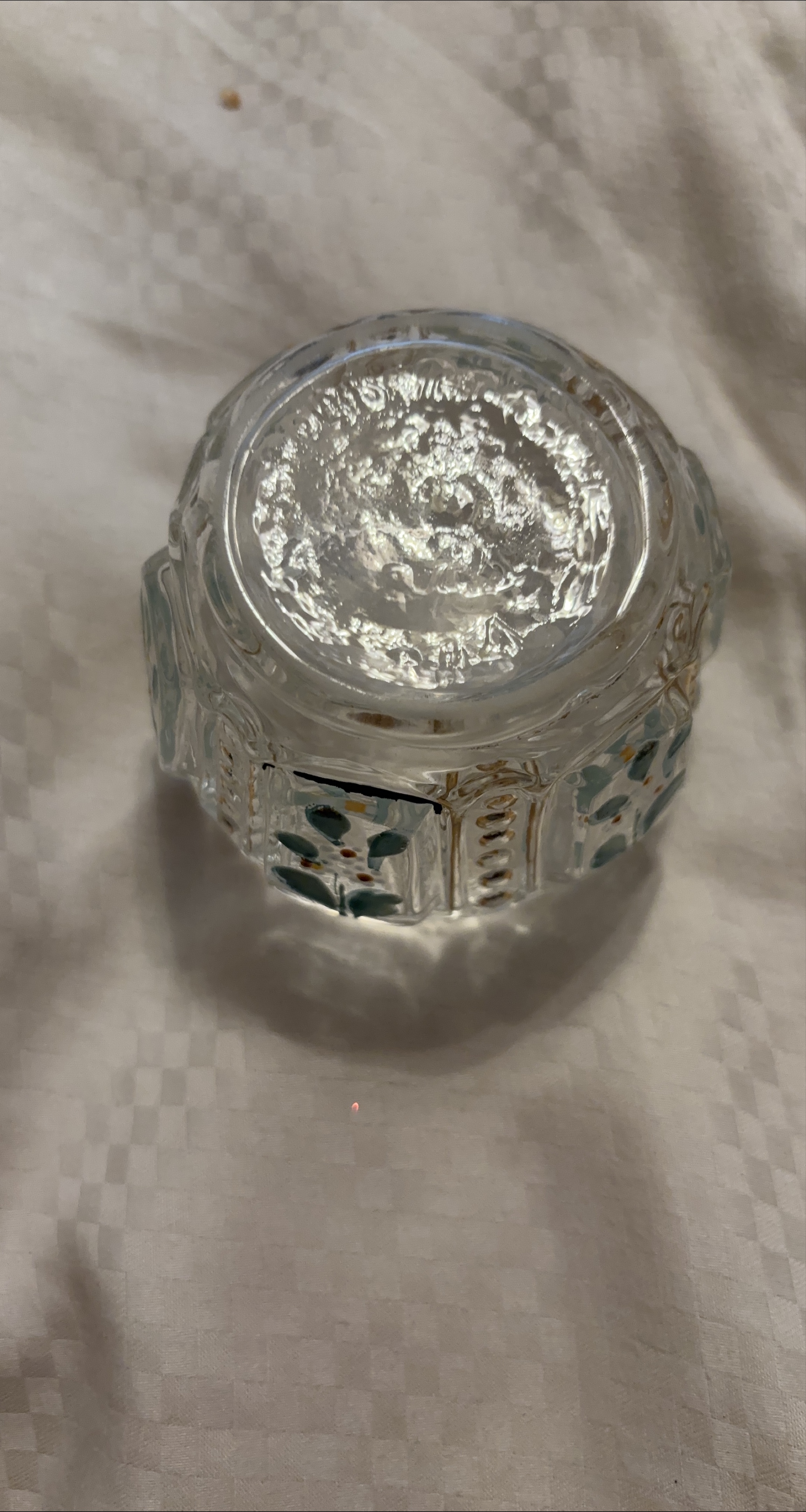 15Here's a decorative glass jar with a unique design. It has a clear glass body with a textured bottom and patterned sides. Perfect for adding a touch of elegance to any room!