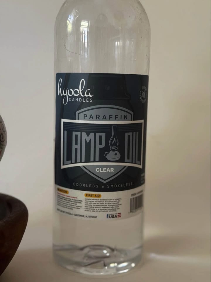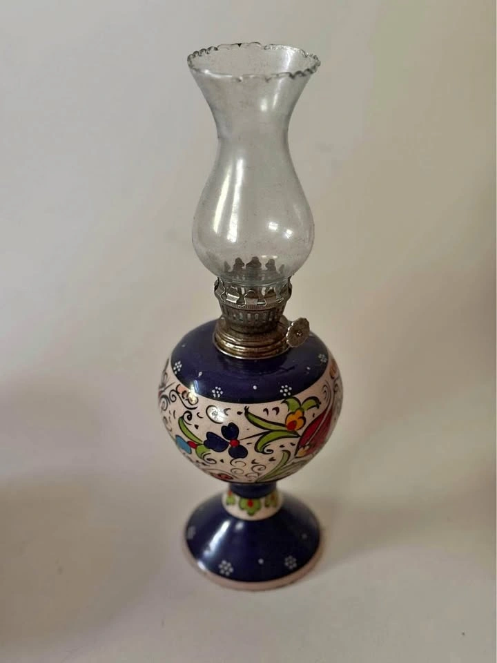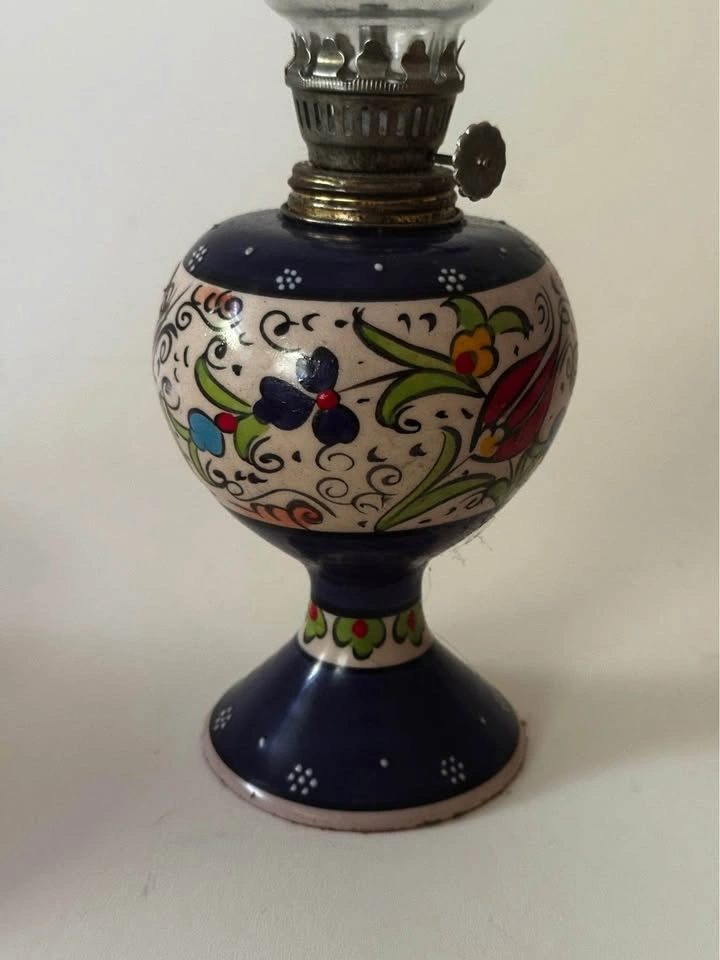 75Hand-painted vintage-style oil lamp with glass chimney. Comes with a bottle of Hyoola clear paraffin lamp oil (partially full). Wick not included. Beautiful decorative piece, also functional with proper wick. Pre-owned, lamp in good condition, oil included. Pickup in Bed-Stuy, Brooklyn.